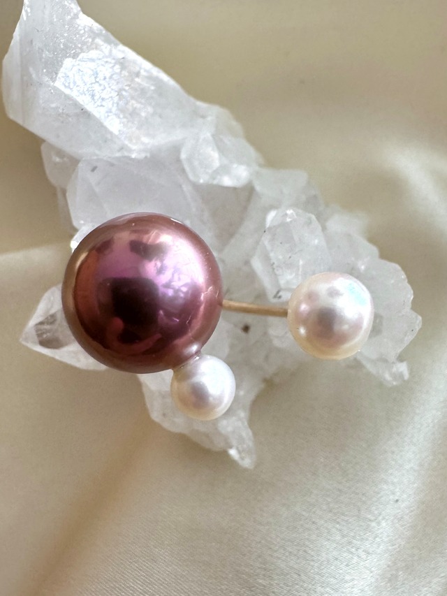【materials】 淡水パール10.5mm あこや真珠(ホワイト)8mm 淡水パール(ピンク)5mm k14gf フリーサイズ (着用イメージ10〜16号ほど) (開口リングで調整可能です) 重さ:約3.5g前後 12号くらいの状態でお送りいたします。 真珠の種類や形、カラーにとらわれず自由な発想で組み合わせるcombination ringシリーズ。 海外から仕入れた赤みのある濃いパープルに照りの良い宇和島産あこや真珠と大人っぽいモーブピンクの小粒を合わせました。 約5年以上ヘビロテに愛用しているパールリングですが、変色は見られずながく綺麗にご愛用いただけるおすすめアイテムです。 上下逆にしてつけても◎その日の気分でお好みで楽しんで。 ※ 金具部部を両手で持ちゆっくり開閉しサイズ調整くださいませ。急に大きな力を与えたり何度も大きく動かすと変形の要因となりますのでご注意くださいませ。 ★アクセサリーの錯視効果★ 指の太さや長さにコンプレックスがある方でも、指を綺麗に長く見せてくれる効果があるデザインです。 シリーズ化していきますがパールは天然の産物のため艶照り色形は同じものはありません。すべてが一点もののとなります。同じレベルのものが次回は見つからなかったり同じ金額で仕入れられないことも多々あり、仕入れも一期一会と思いその時ときめく一粒を厳選して仕入れております。 お気に入りが見つかりましたらぜひお迎えいただけましたら幸いです。 天然石や天然パールは綺麗なものを選別して使用しておりますが、天然の副産物ですので小さなクラック(ひび)やえくぼ・黒点などがある場合がありますが、返品や交換の対象となりませんのでご了承くださいませ。 ご使用後はお手持ちのジュエリークロスで優しく拭くと長く綺麗にお使いいただけます。