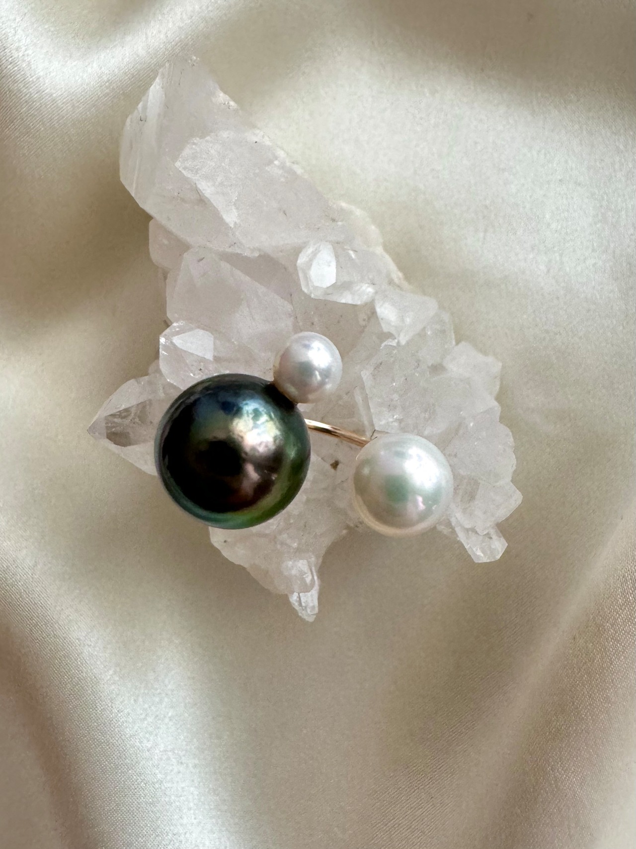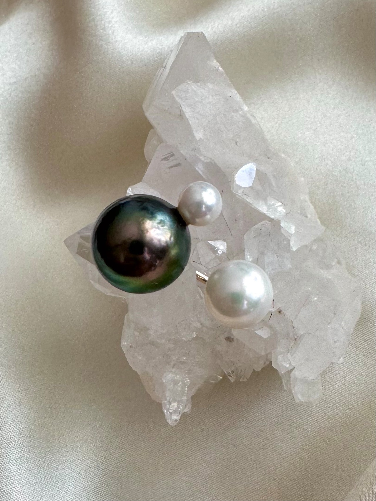 なんともいえない妖艶なピーコックな黒蝶を際立たせるため青みを帯びたホワイトパールを合わせコントラストが美しい仕上がりを目指しました。