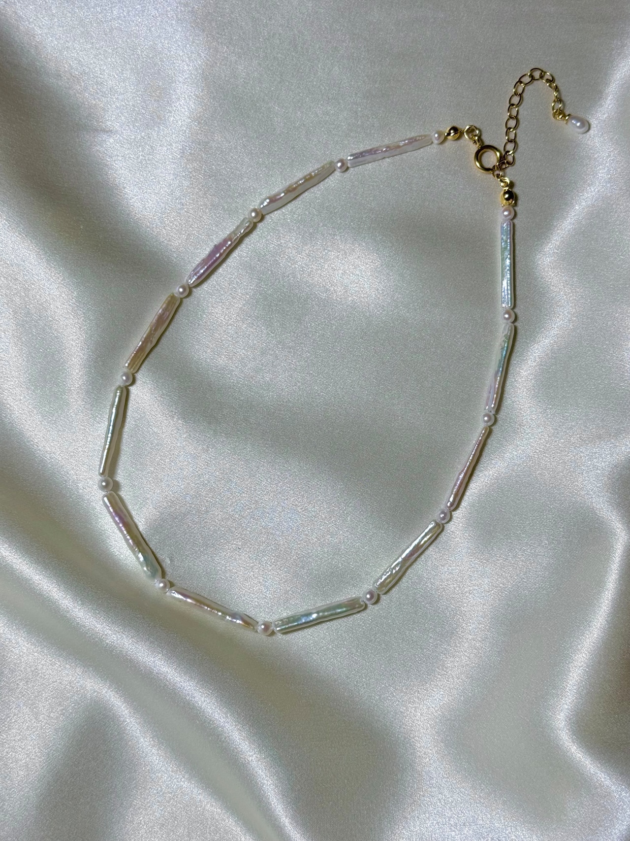 ギラッギラのオーロラの干渉色がとってもキレイで、つい手が伸びてしまったこちらのスティック系のパール。ラウンド系の連ネックレスに比べると、スッキリして重ね付けもこなれた印象に。チョーカーのようにつけたり、色々と重ね付けしてみたりと組み合わせの幅が広がる一本です。