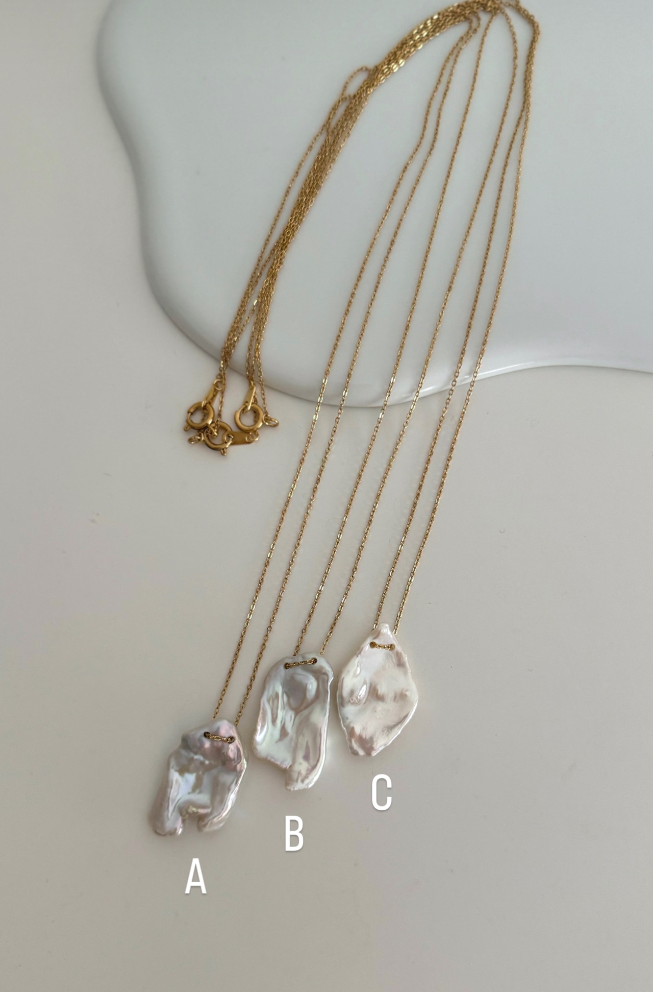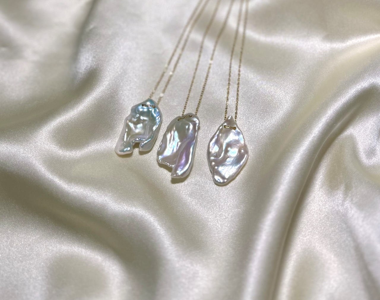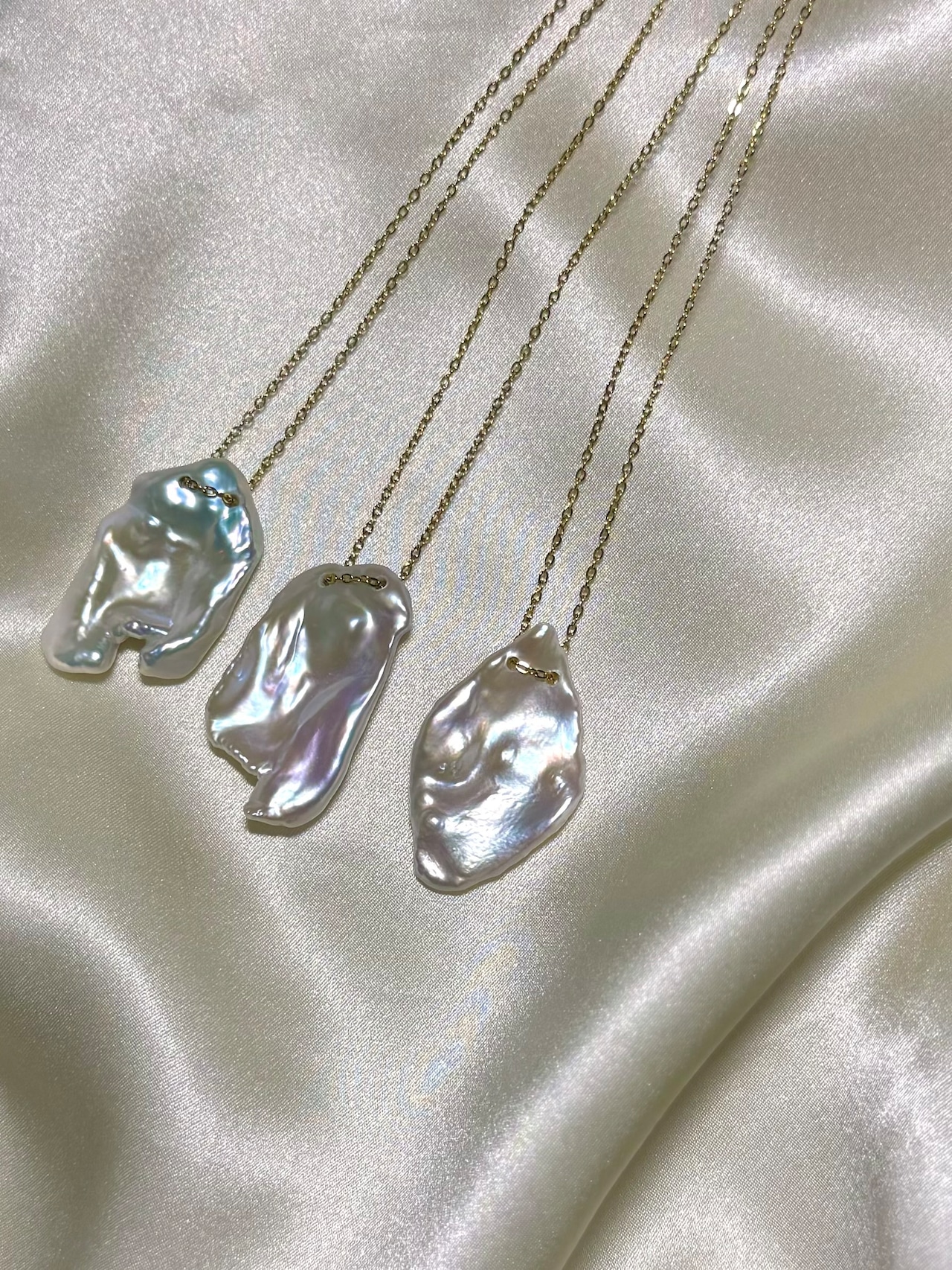 なかなか手に入らない30mmオーバーのとっても大きなケシパールをネックレスのバチカンを省いたモダンなスタイルに仕立てました。