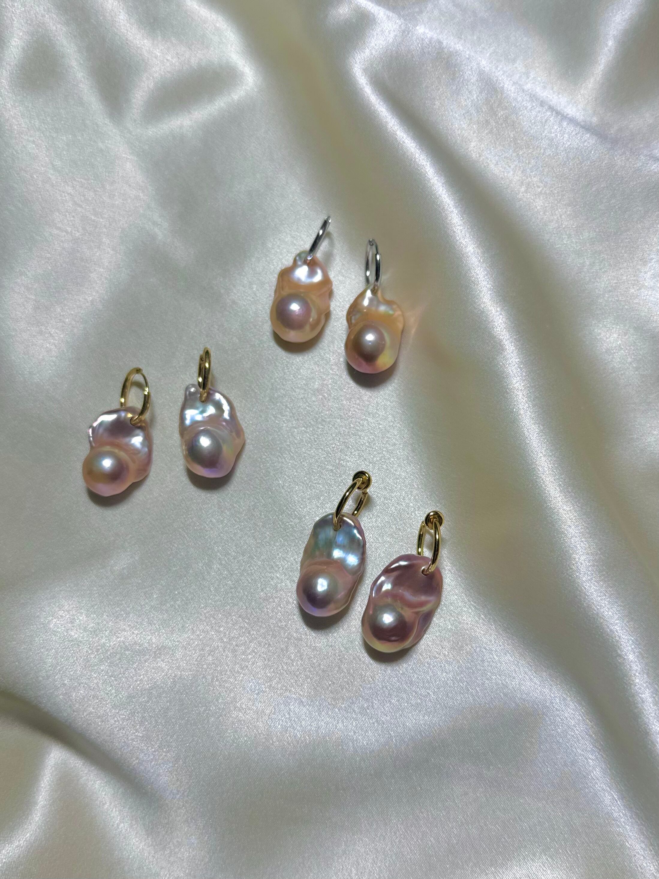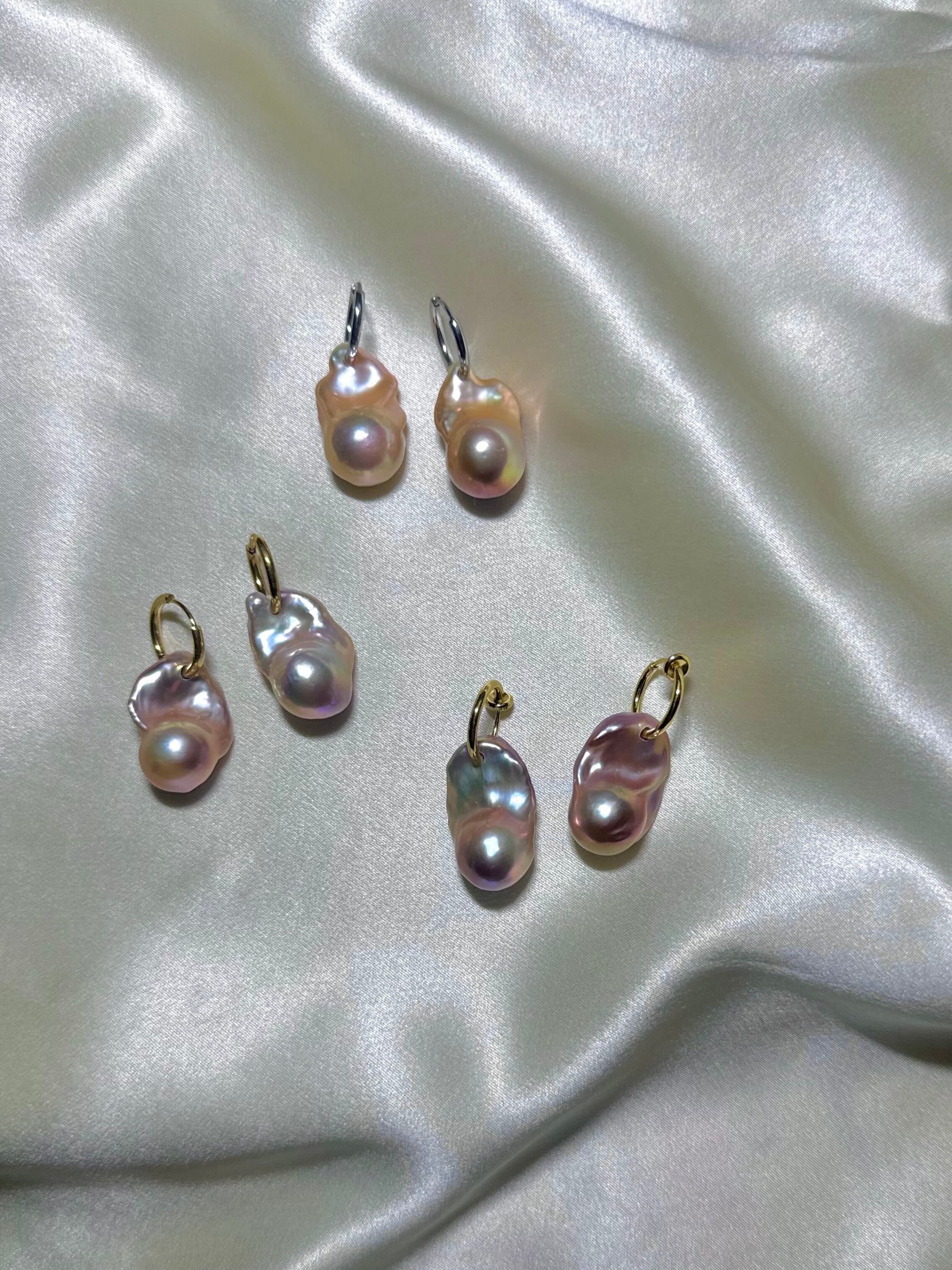バロックパールに直接フープ金具を通したシンプルでモダンなデザインに。