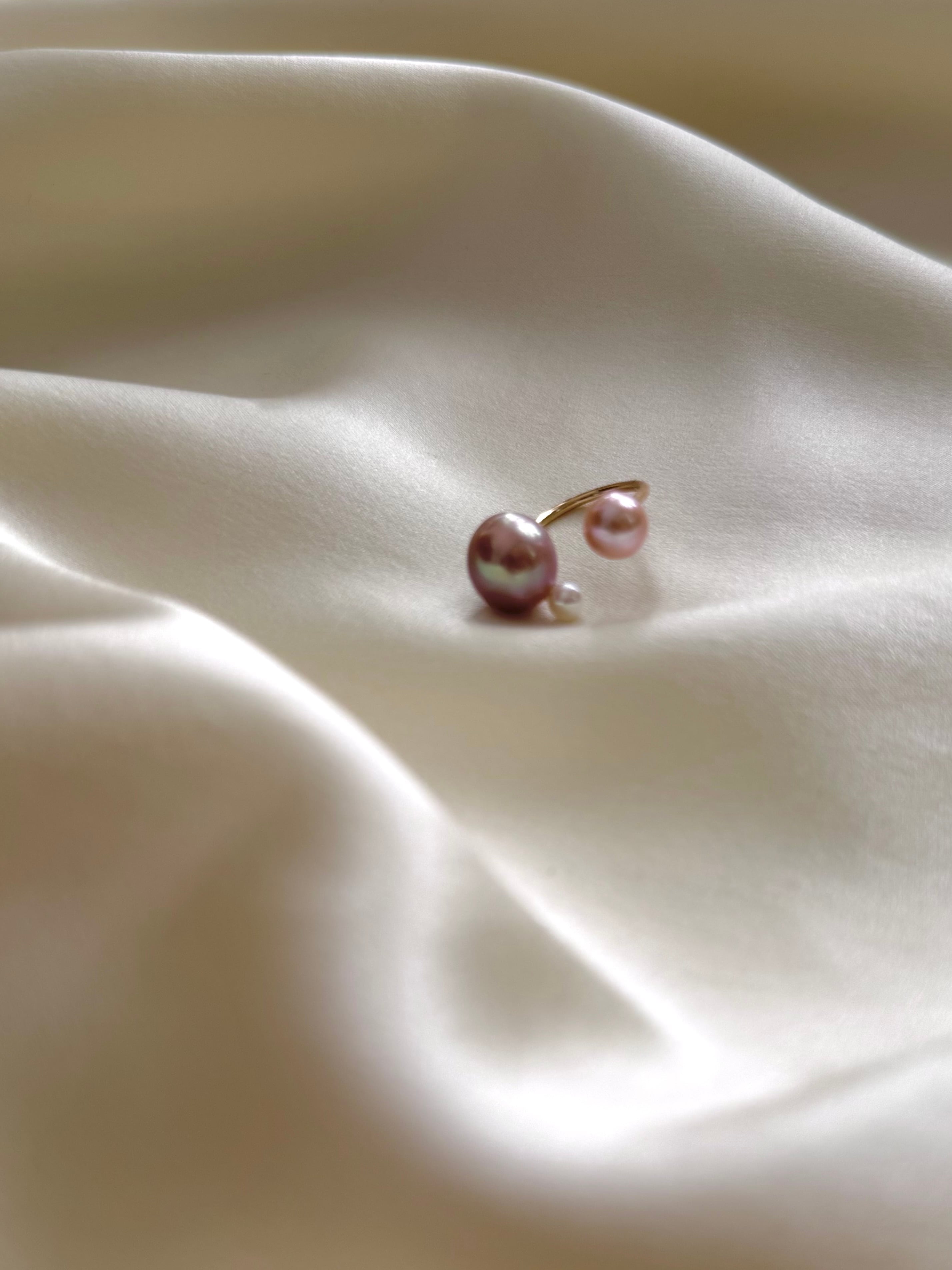 大きなメインパールを指の間に収めるようにつけるのがデザイナー的オススメなつけ方です◎