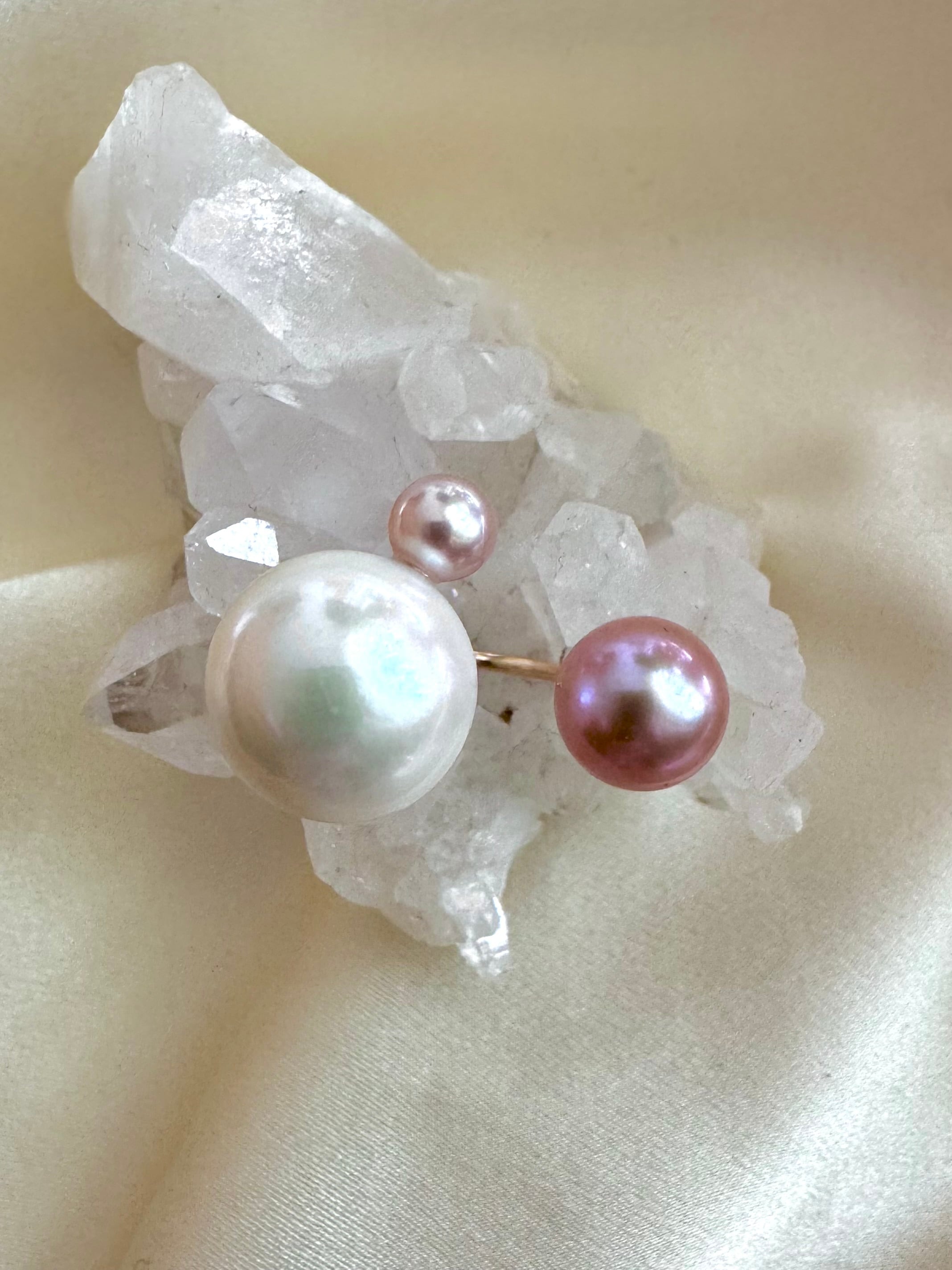 ぶりんとしたサイズ感の艶々の大珠ホワイトを手に入れたので照りの良いピンク系パールたちで優しい色合いに仕上げました。