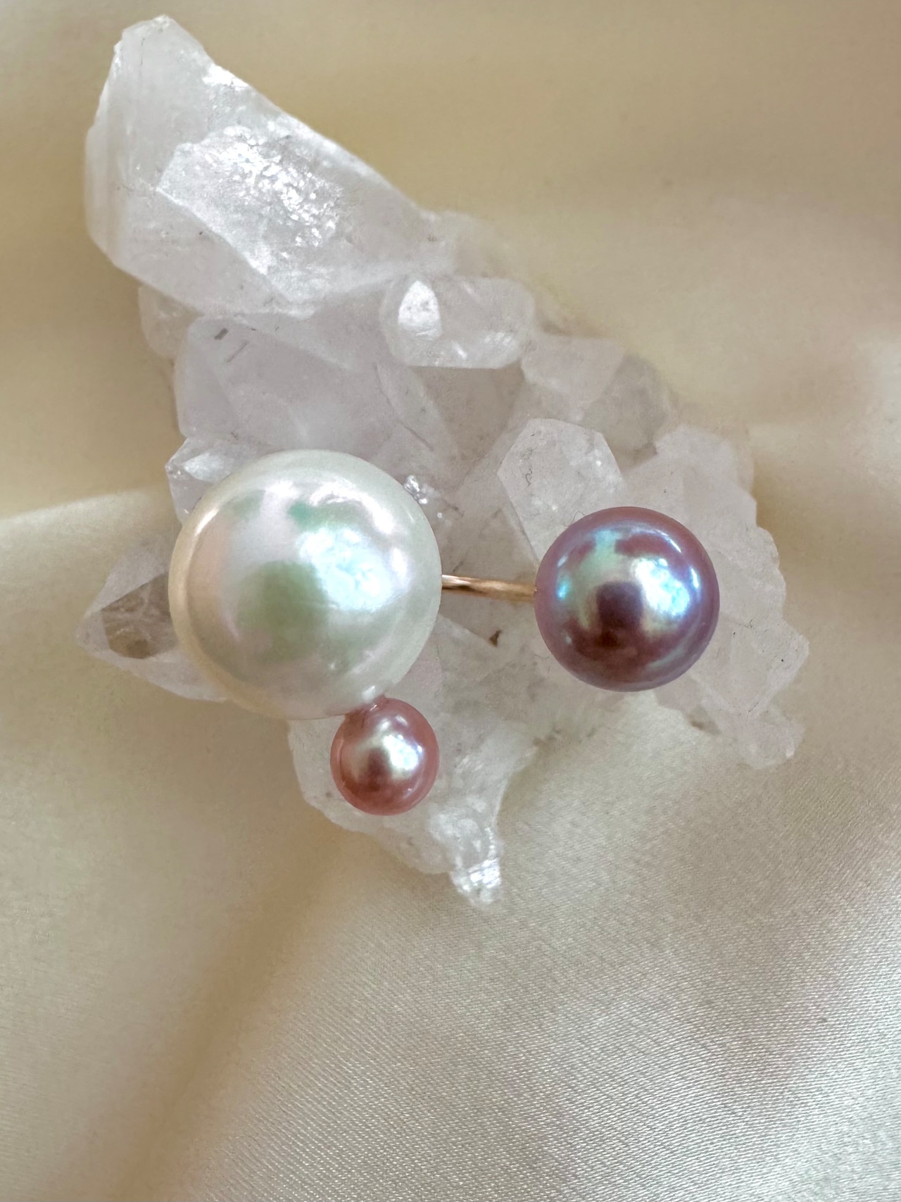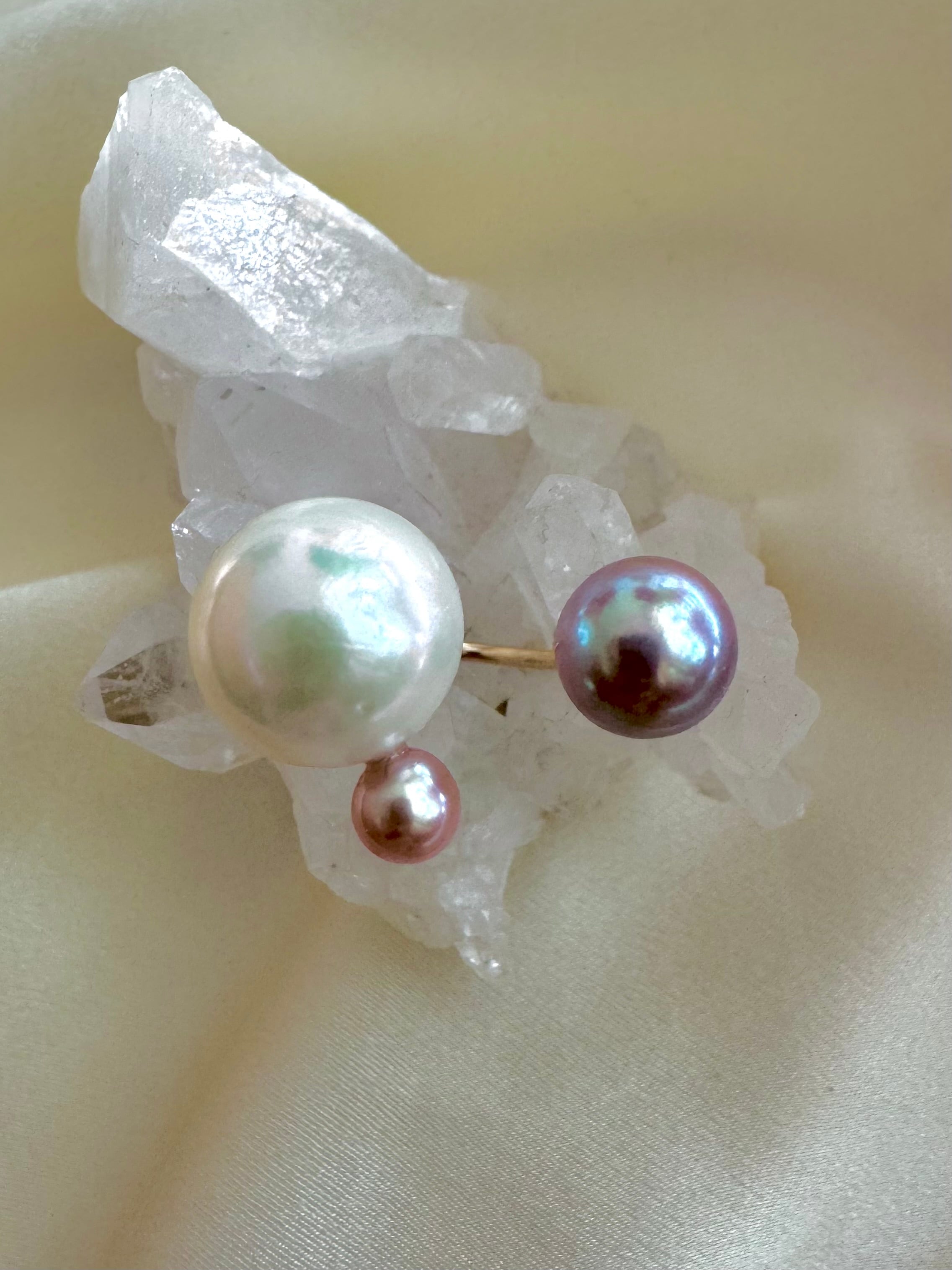 ぶりんとしたサイズ感の艶々の大珠ホワイトを手に入れたので青みがかったピンク系パールたちで大人可愛く仕上げました。