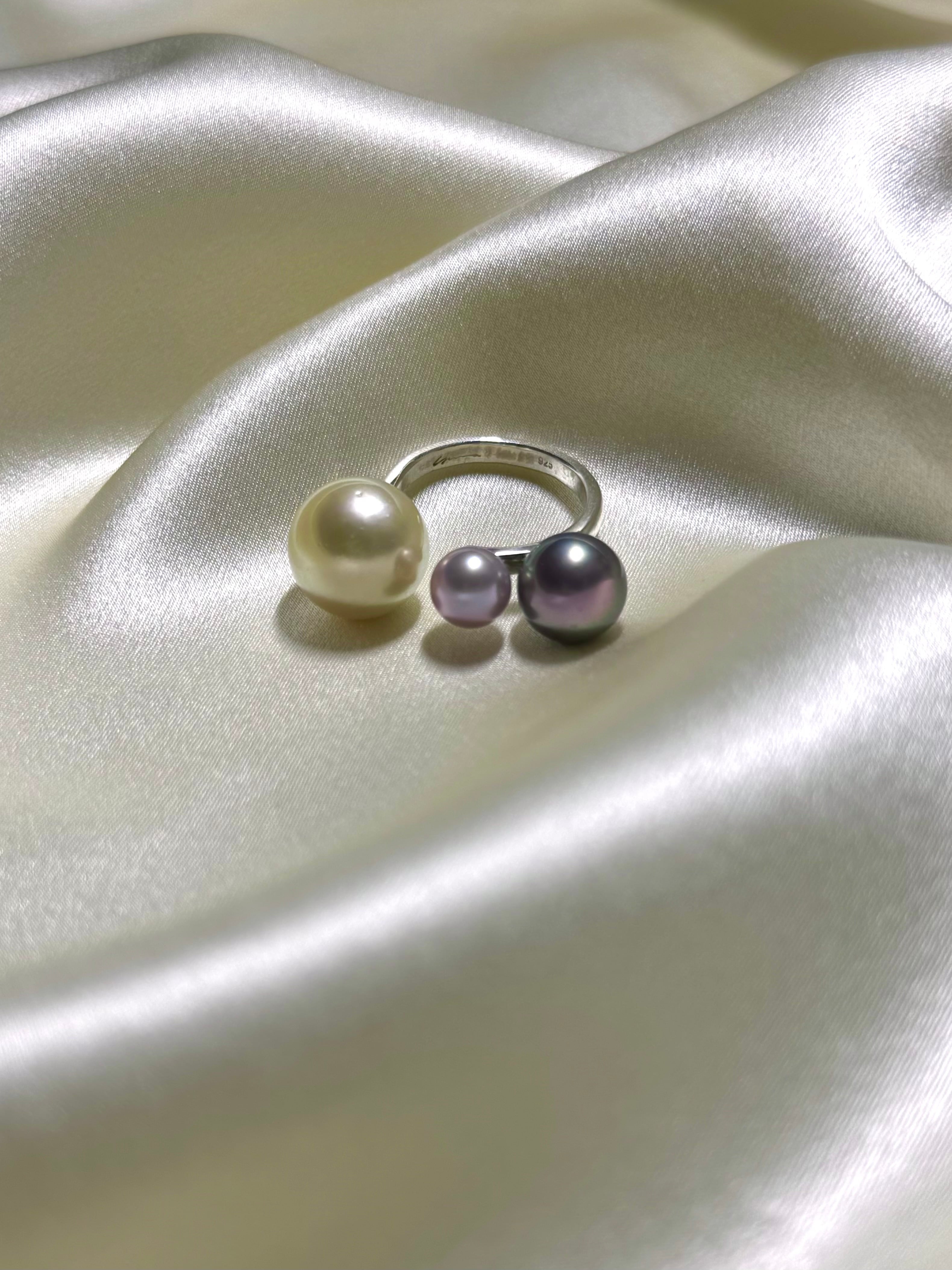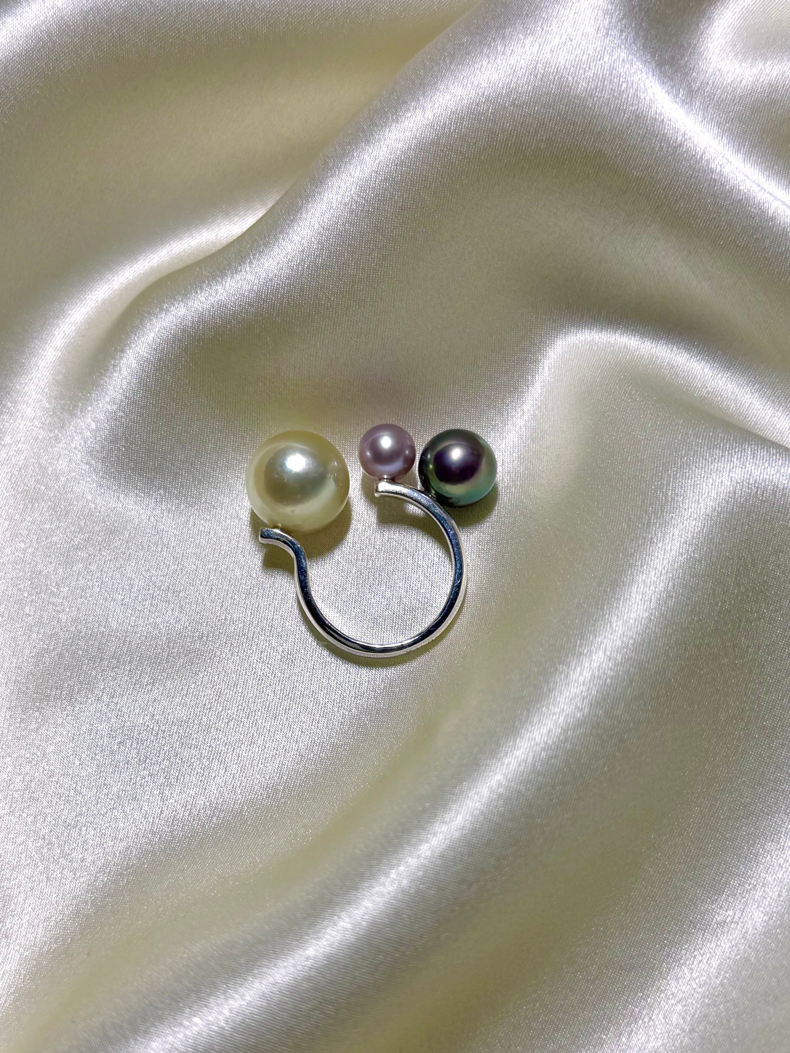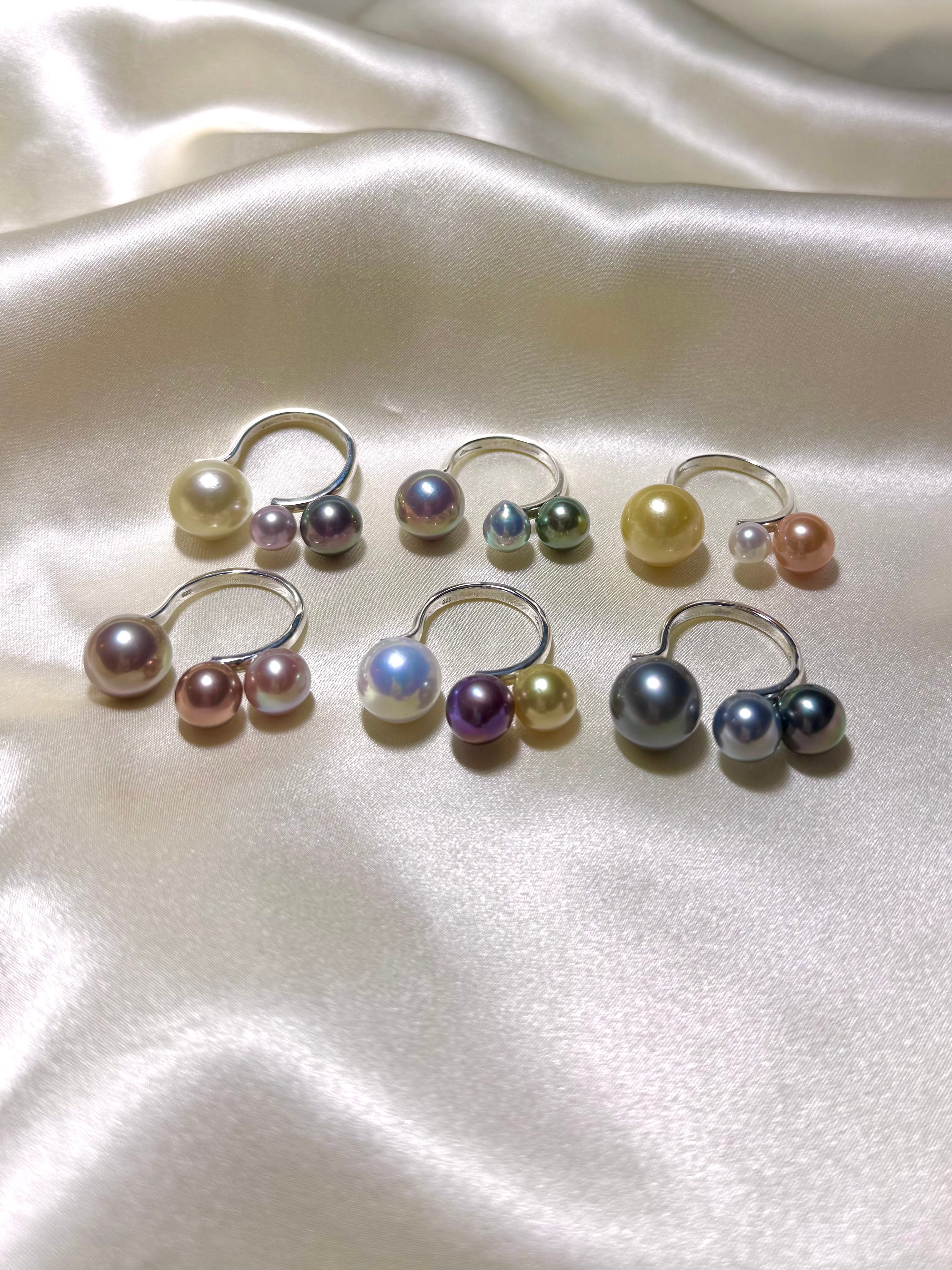 厳選したパールから更に厳選した珠を使用した拘りのパールたちが指の上で軌道を描くように配置されたモードなデザイン。
