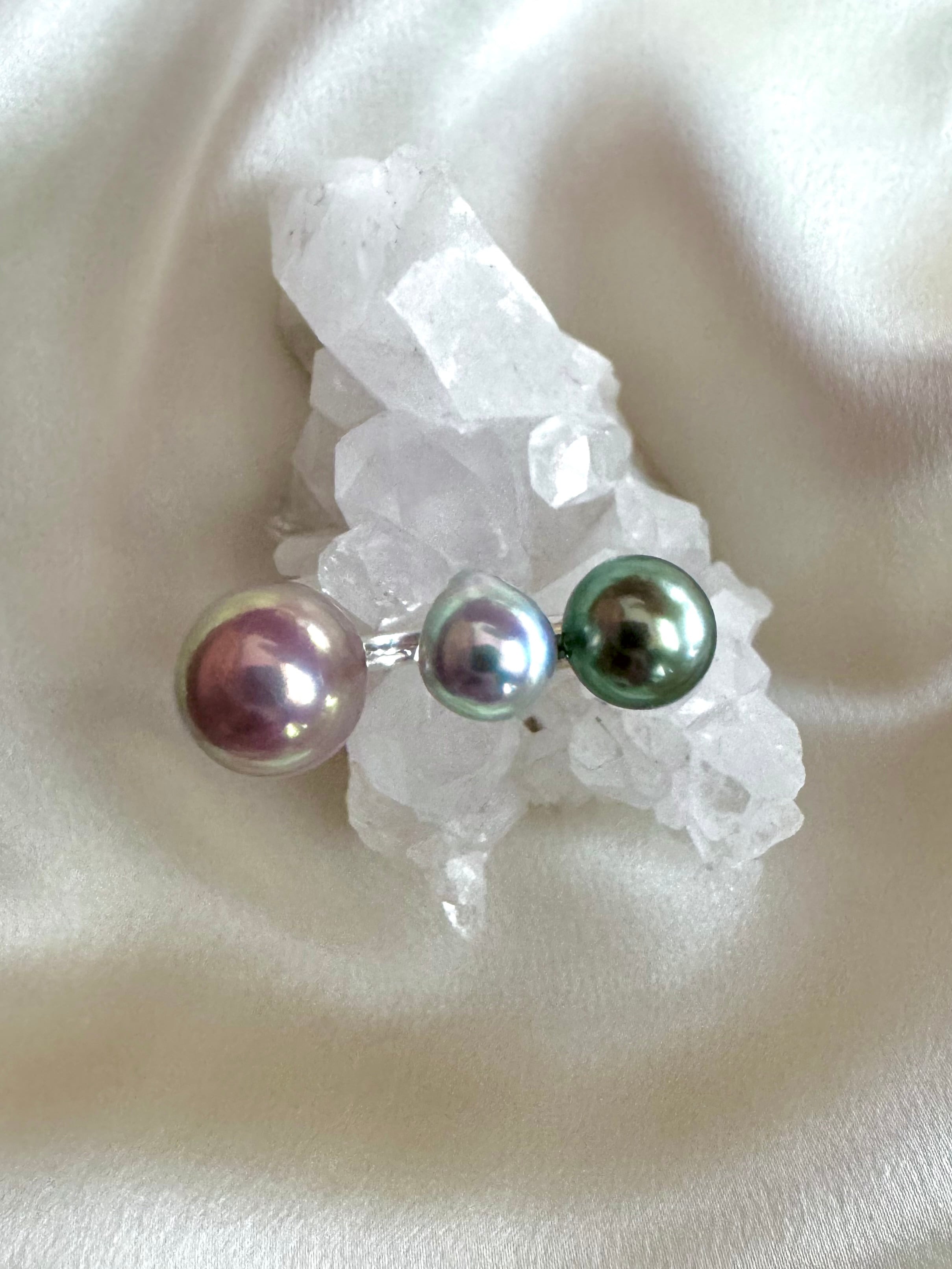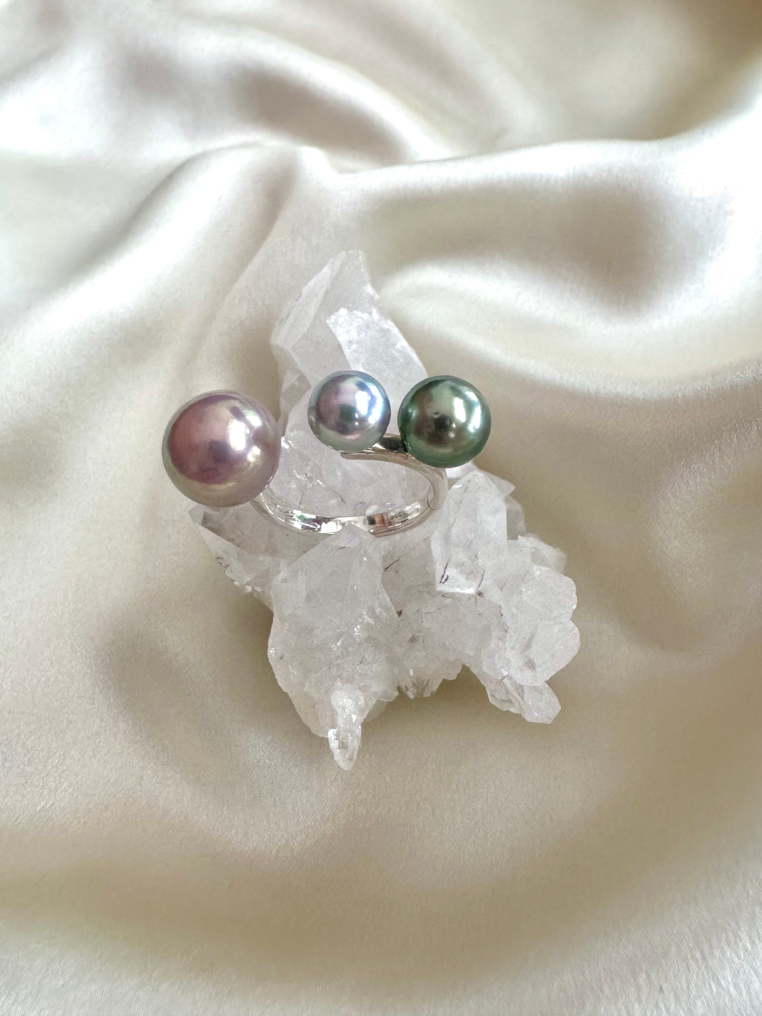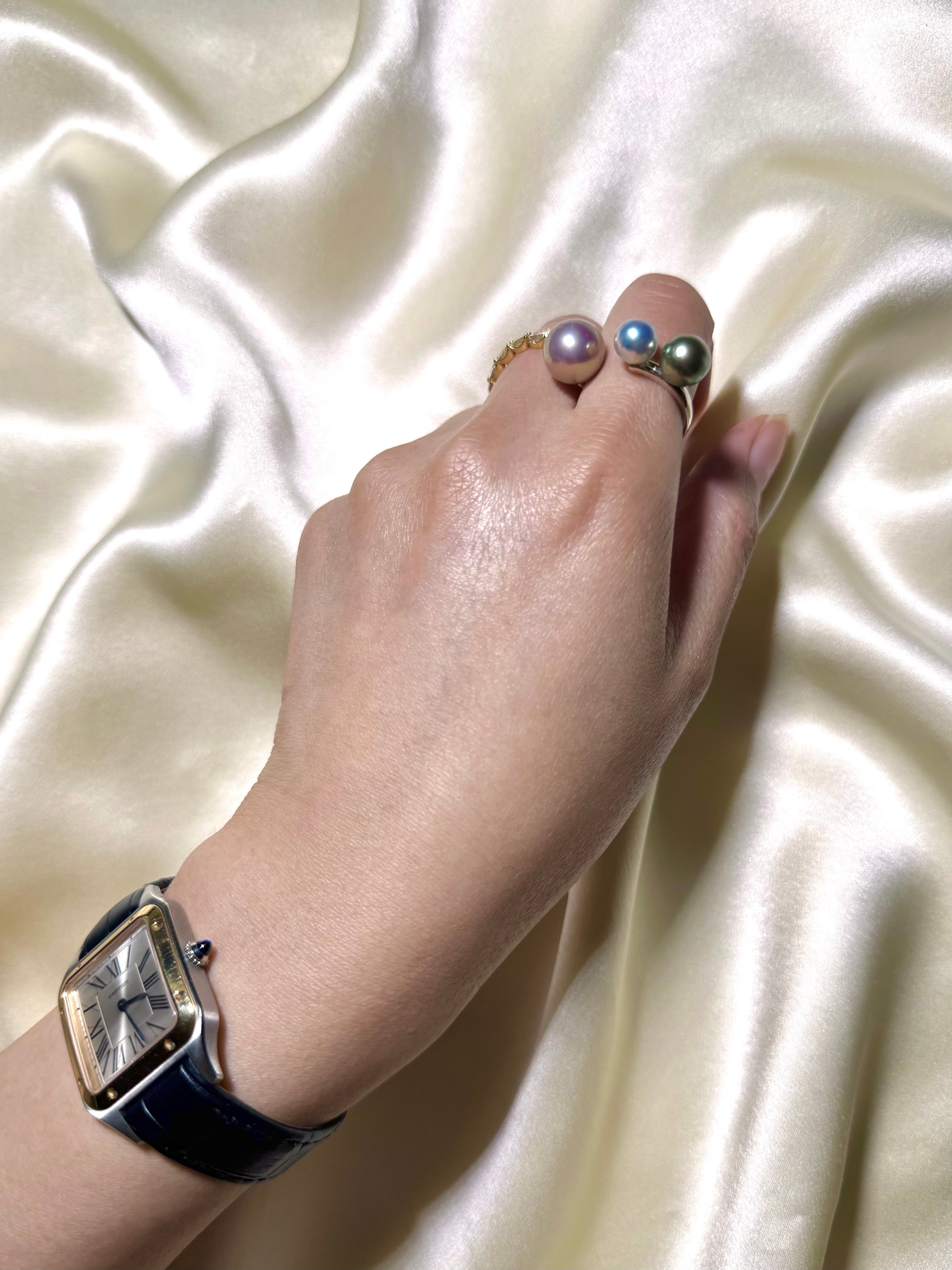 厳選したパールから更に厳選した珠を使用した拘りのパールたちが指の上で軌道を描くように配置されたモードなデザイン。