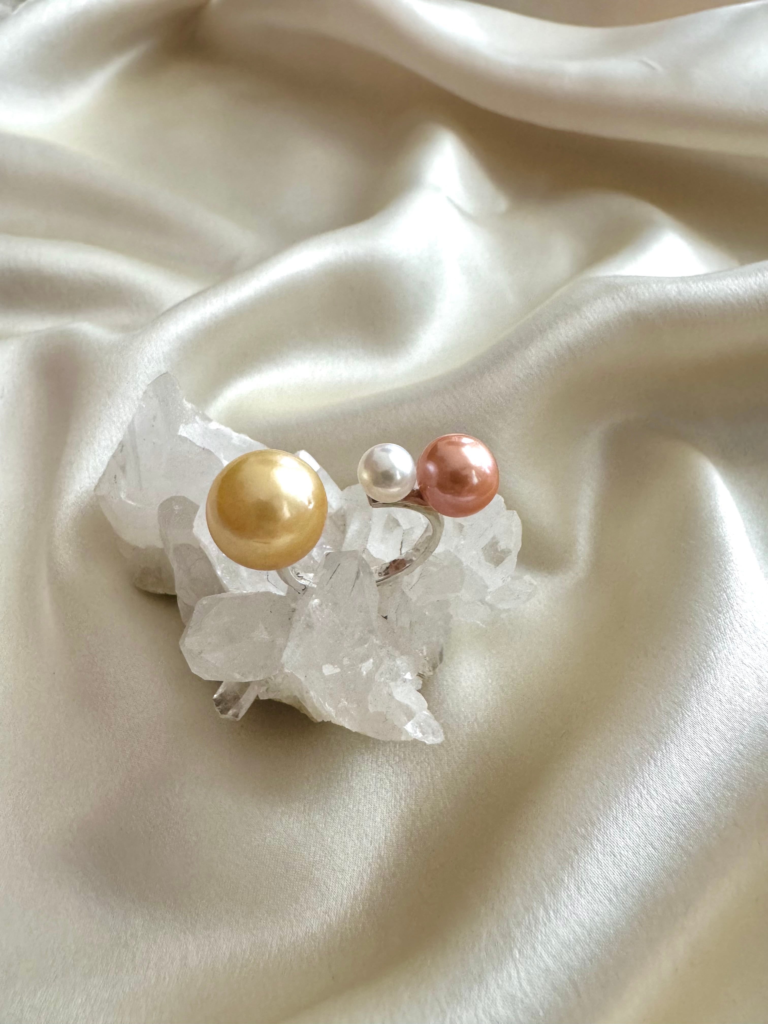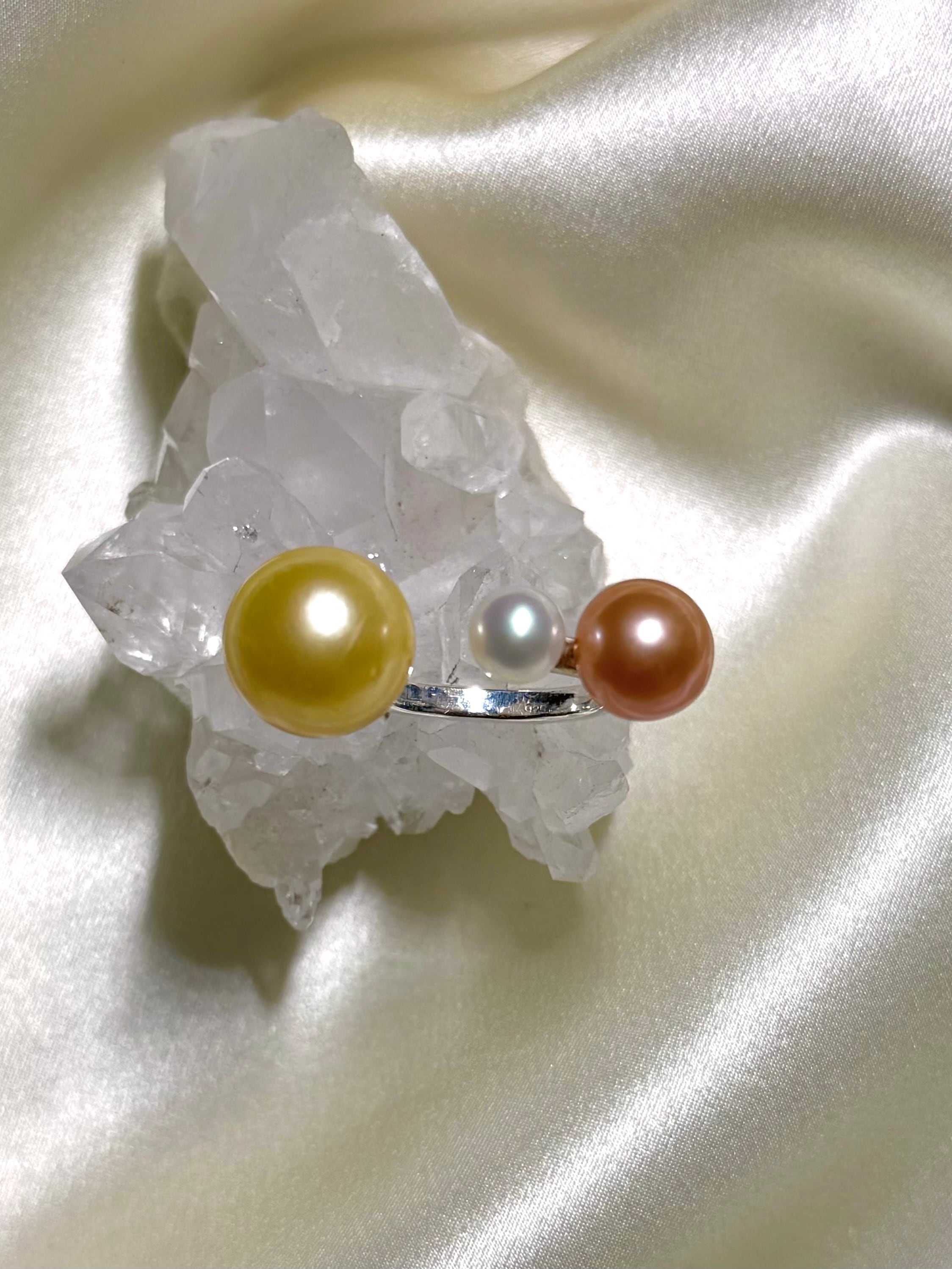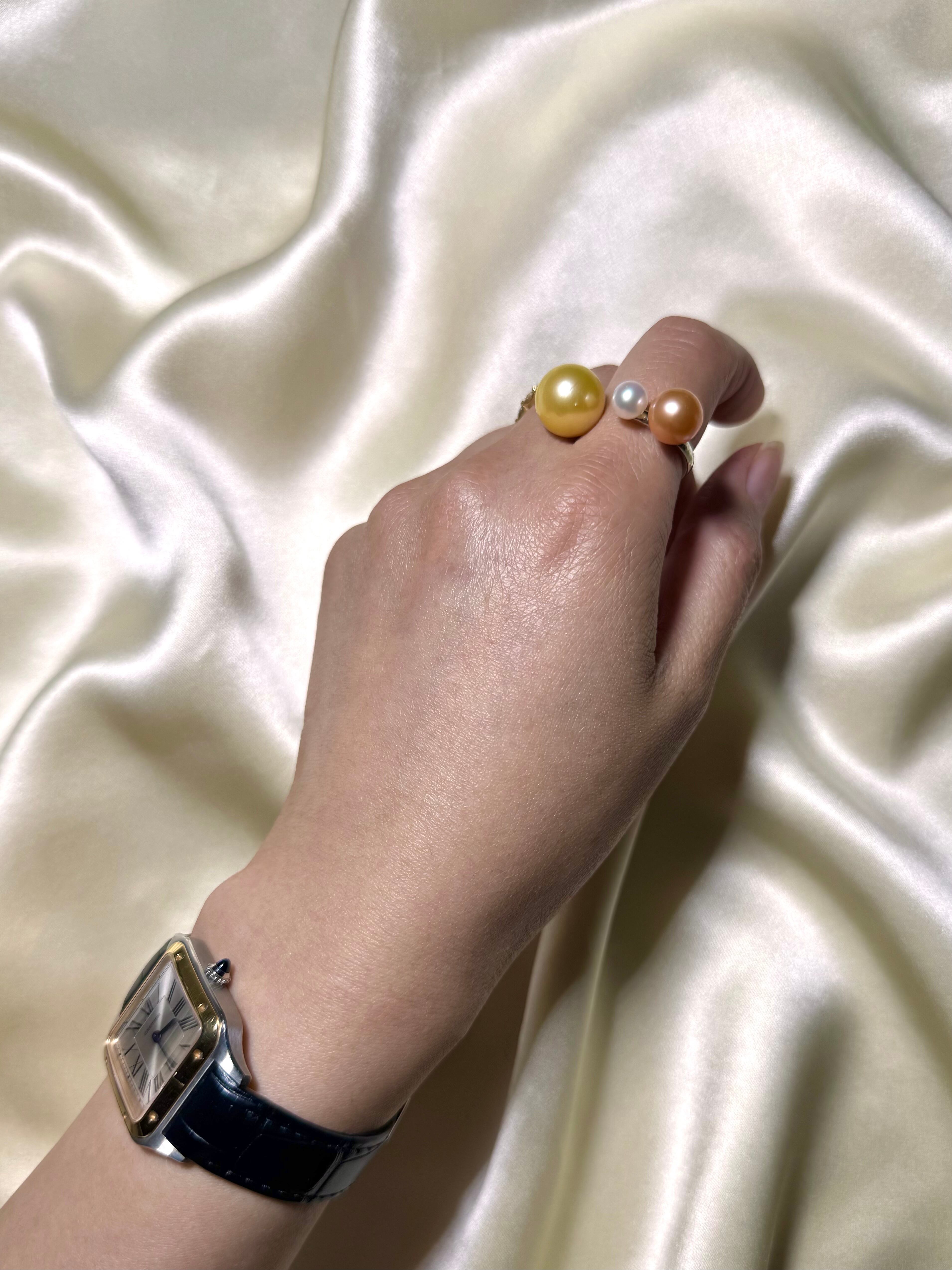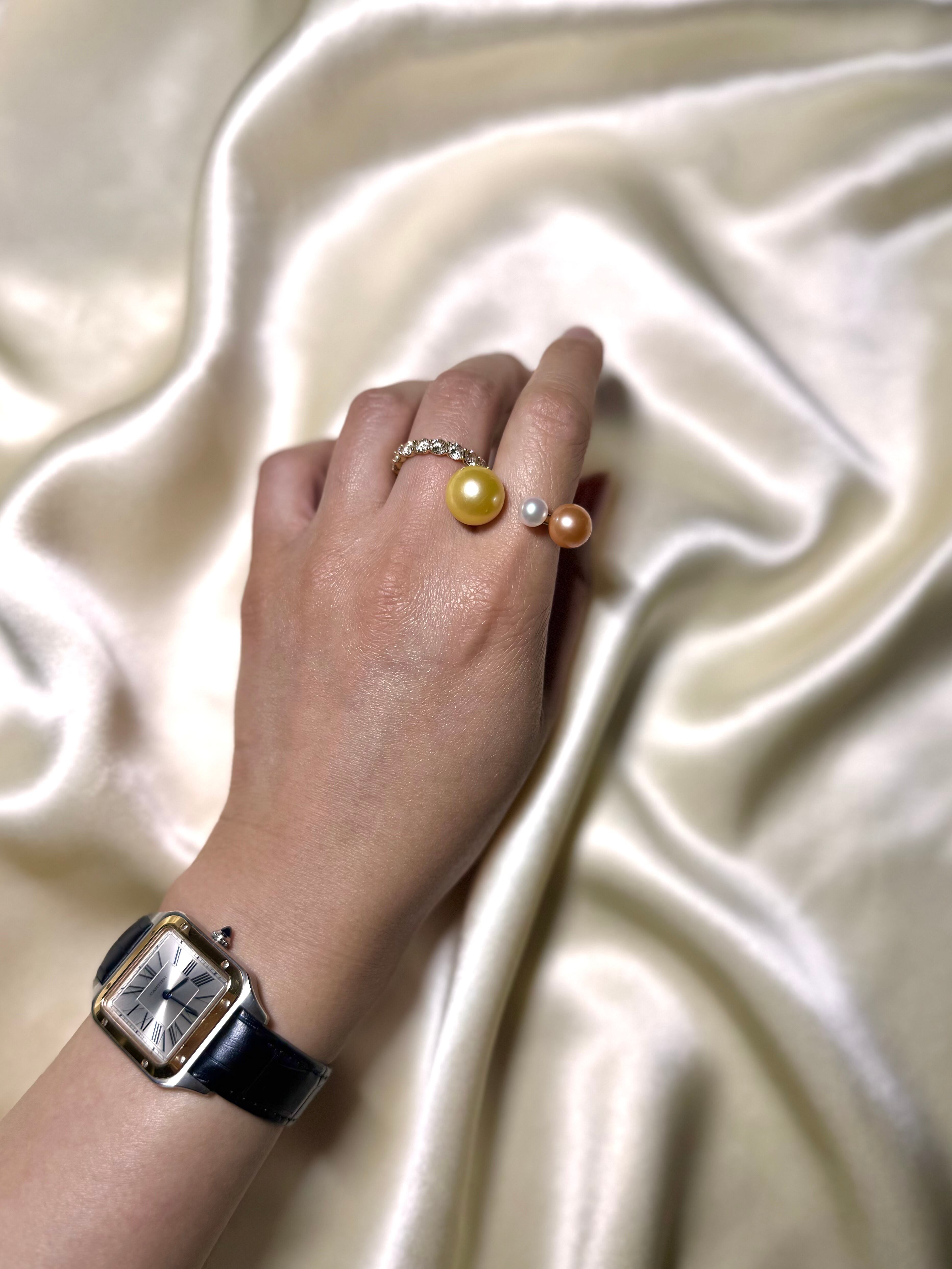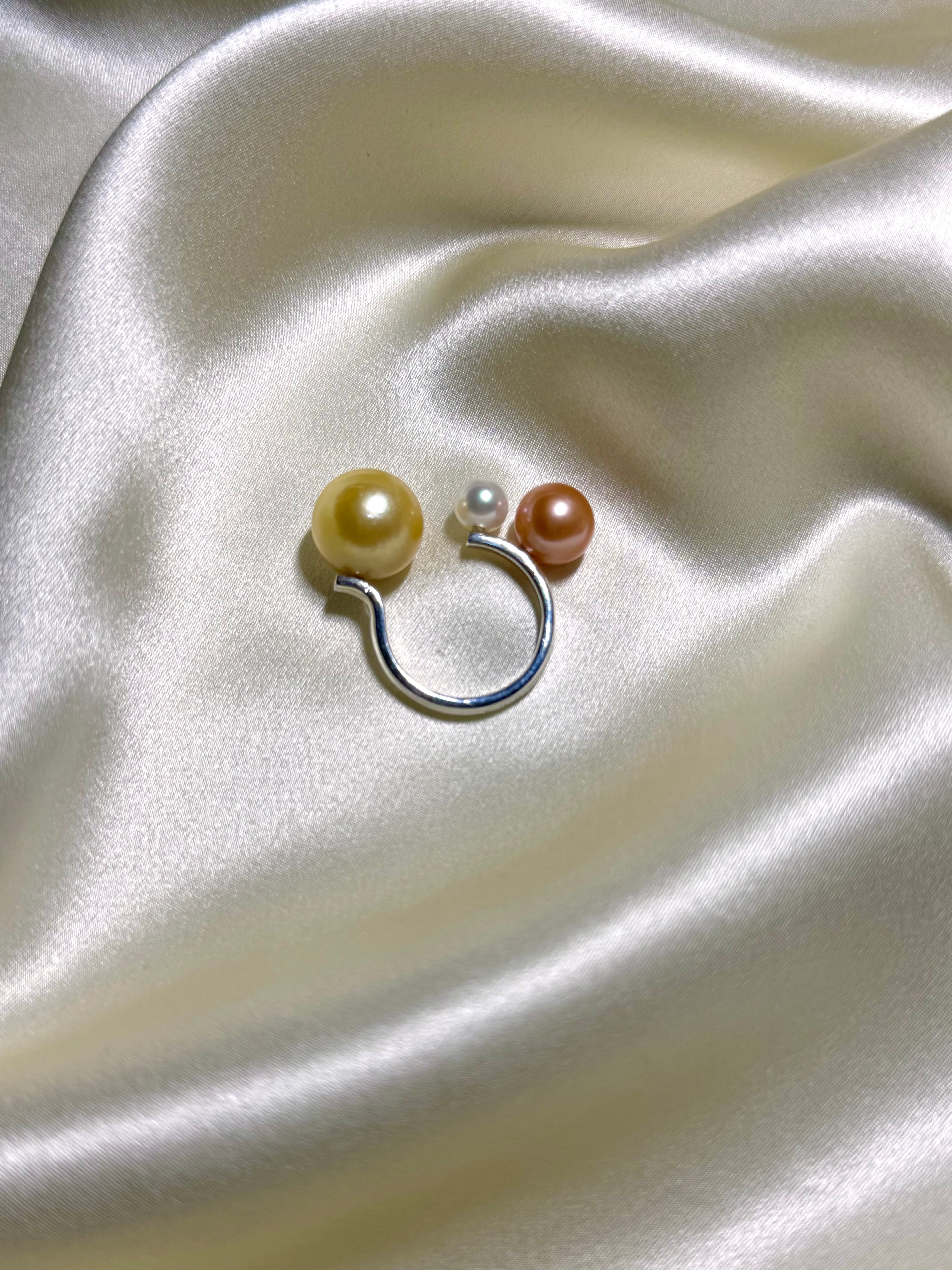 厳選したパールから更に厳選した珠を使用した拘りのパールたちが指の上で軌道を描くように配置されたモードなデザイン。