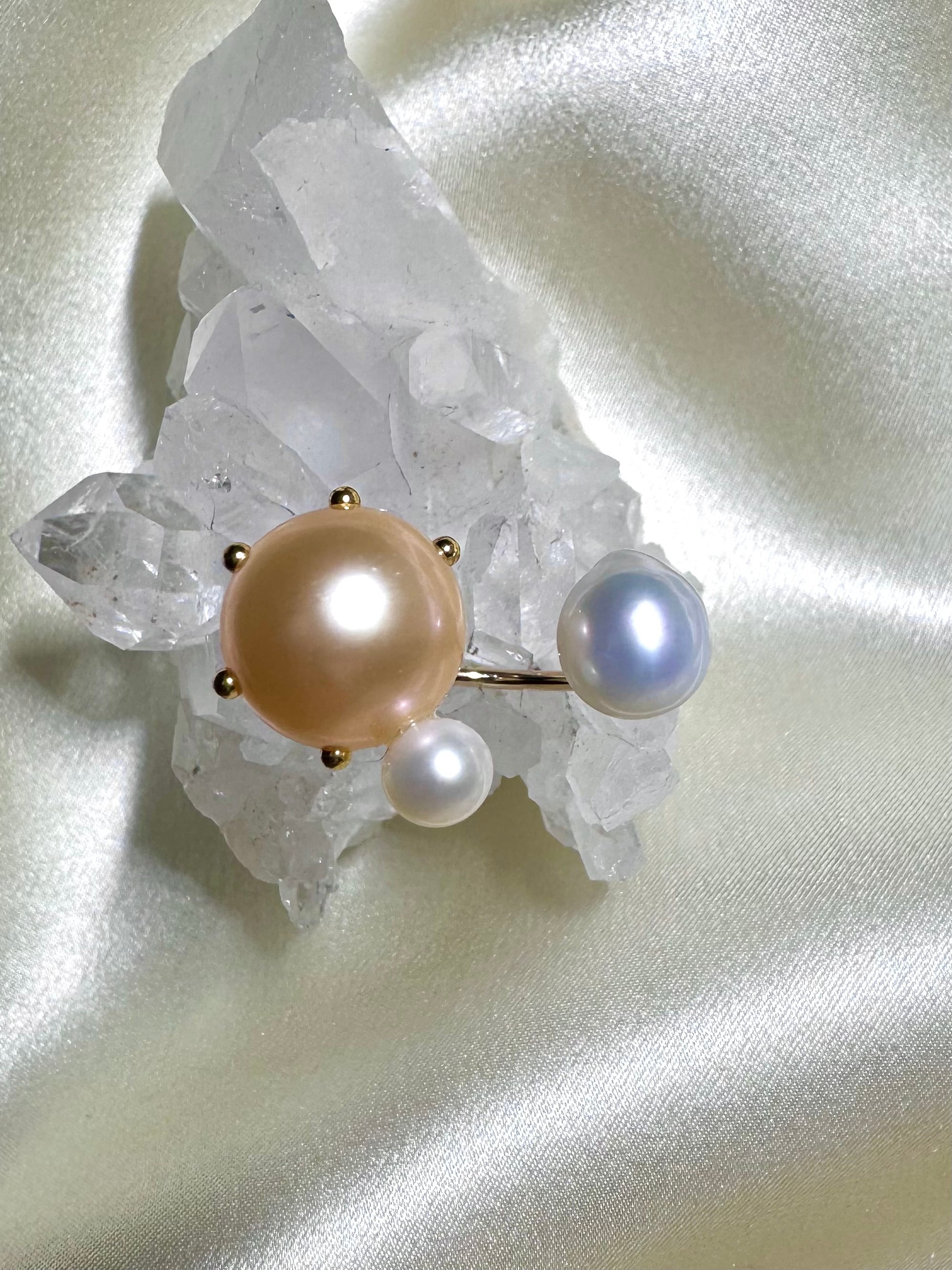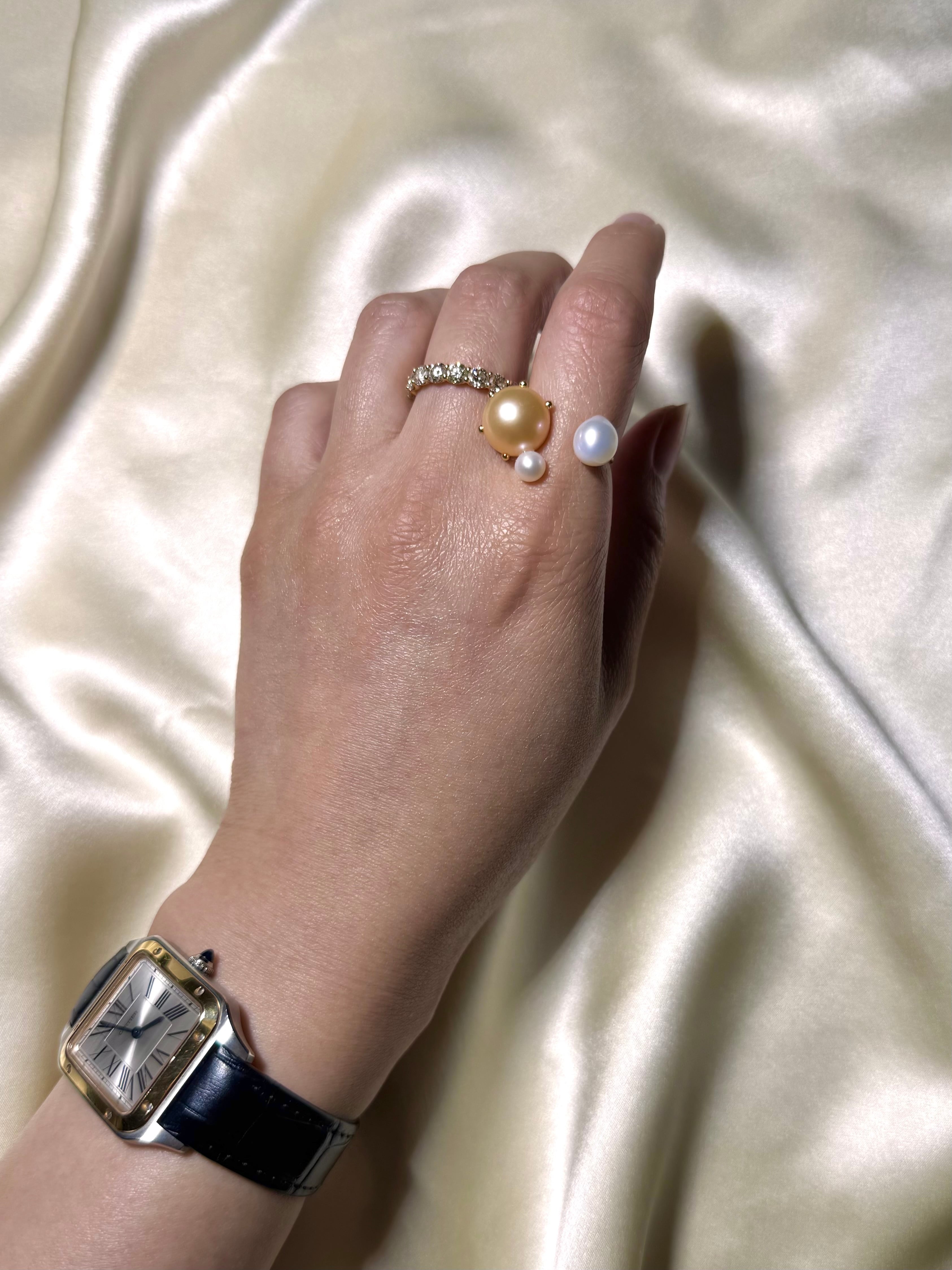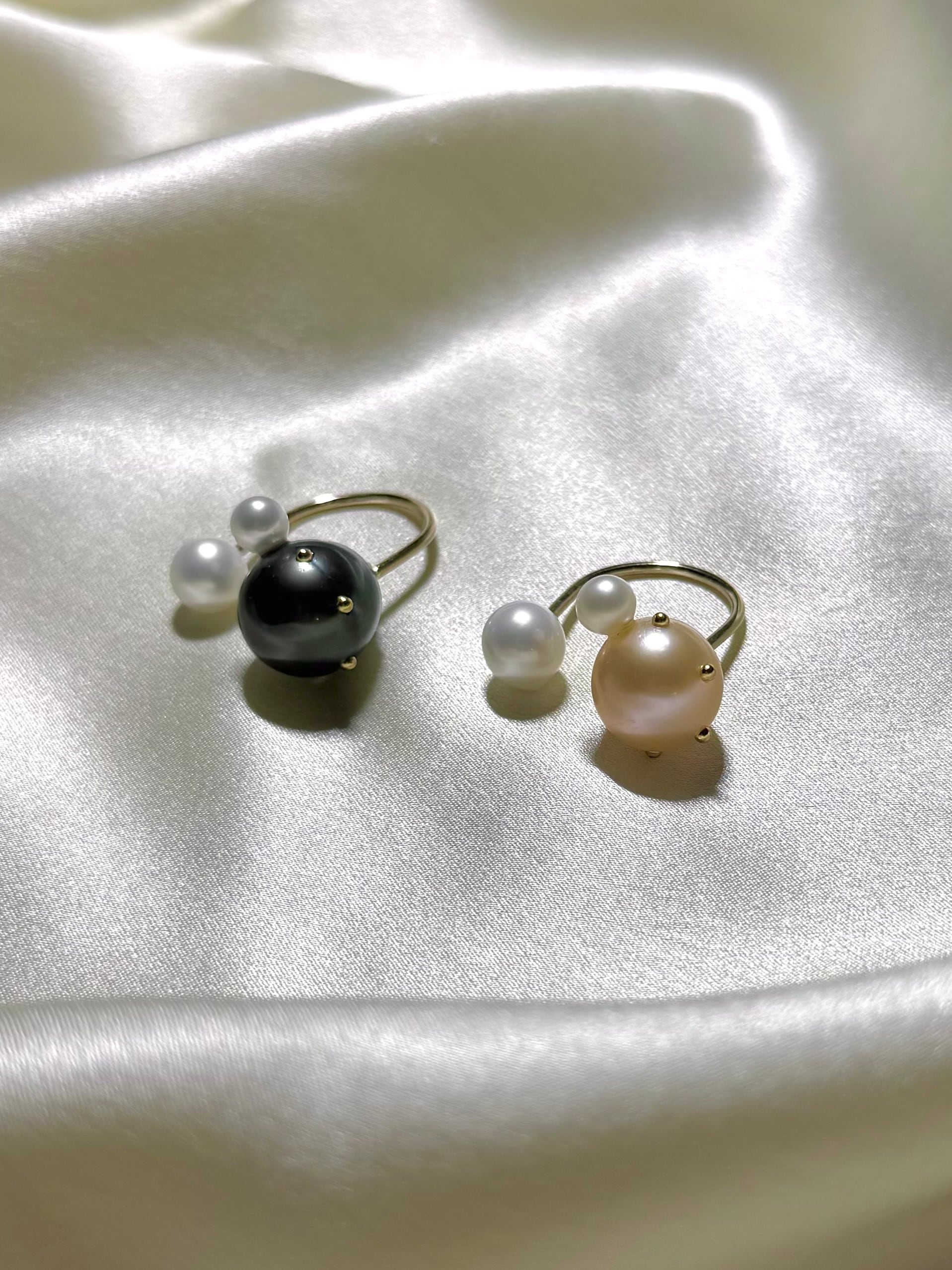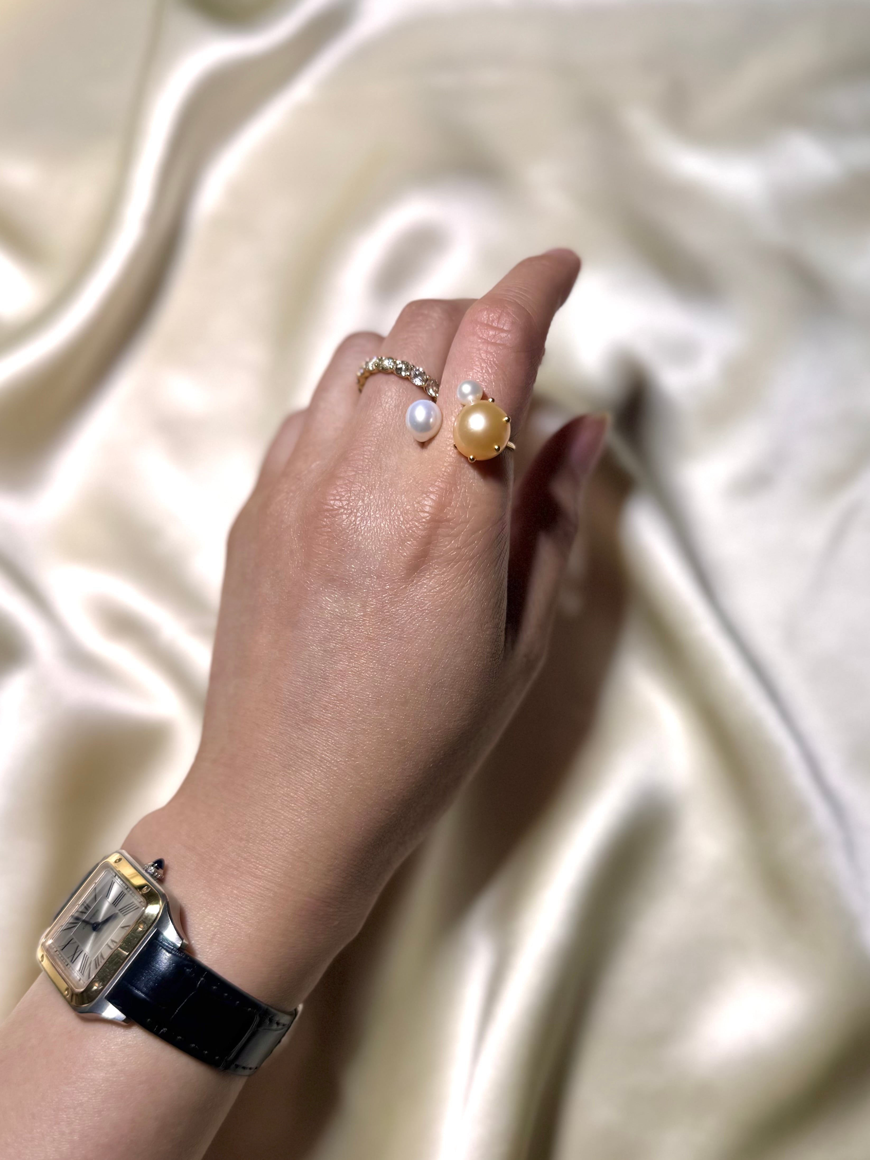 yumaの看板アイテムとなった大中小のパールがリズムよく指の上で吸いつくように並んだyuma ring。