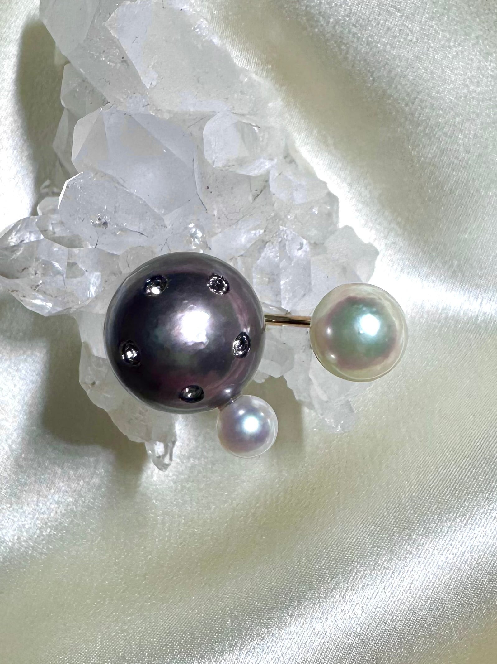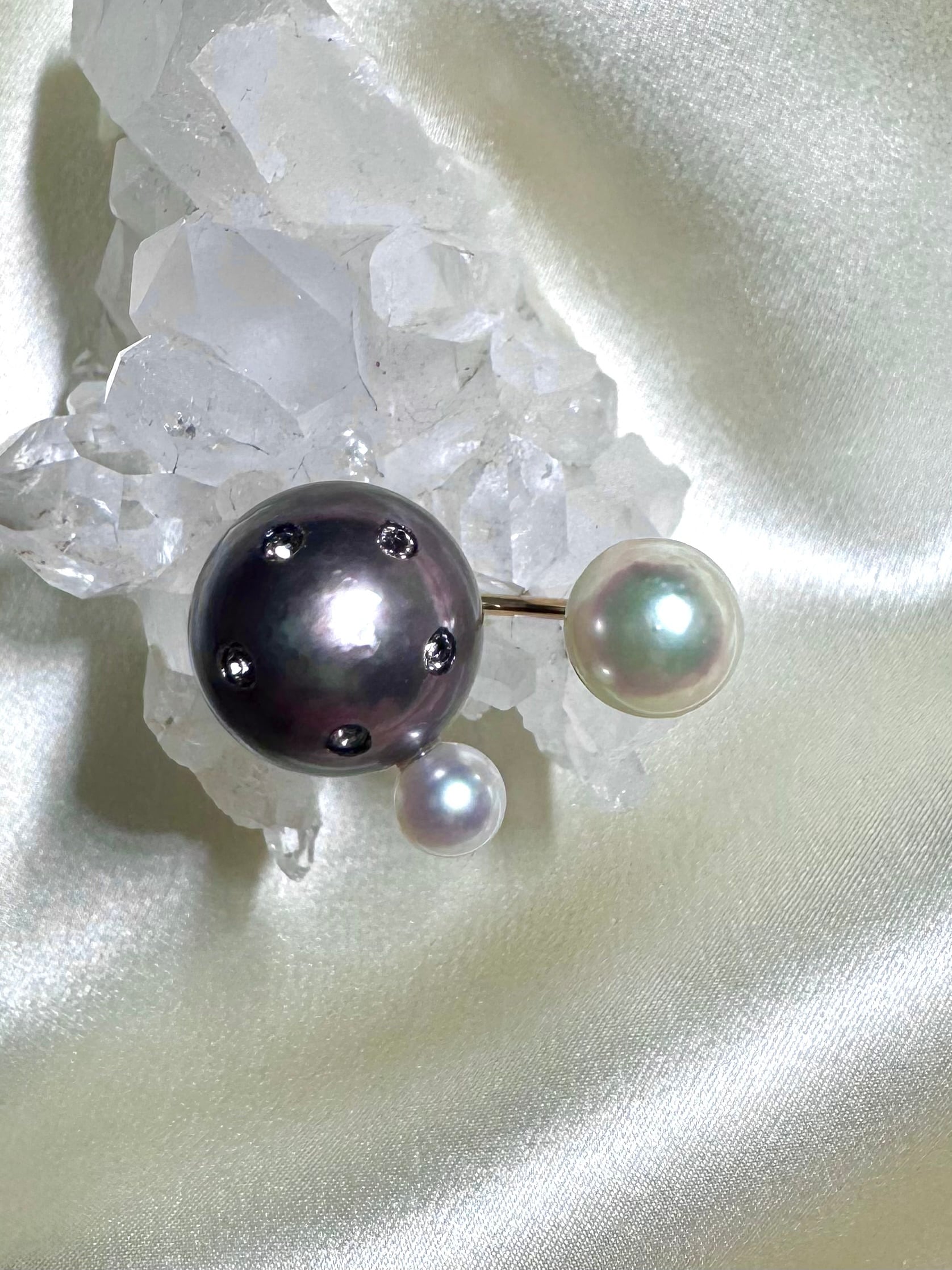 セカンドで合わせた宇和島産のあこや真珠もオーロラの干渉色を纏っていて素敵です。