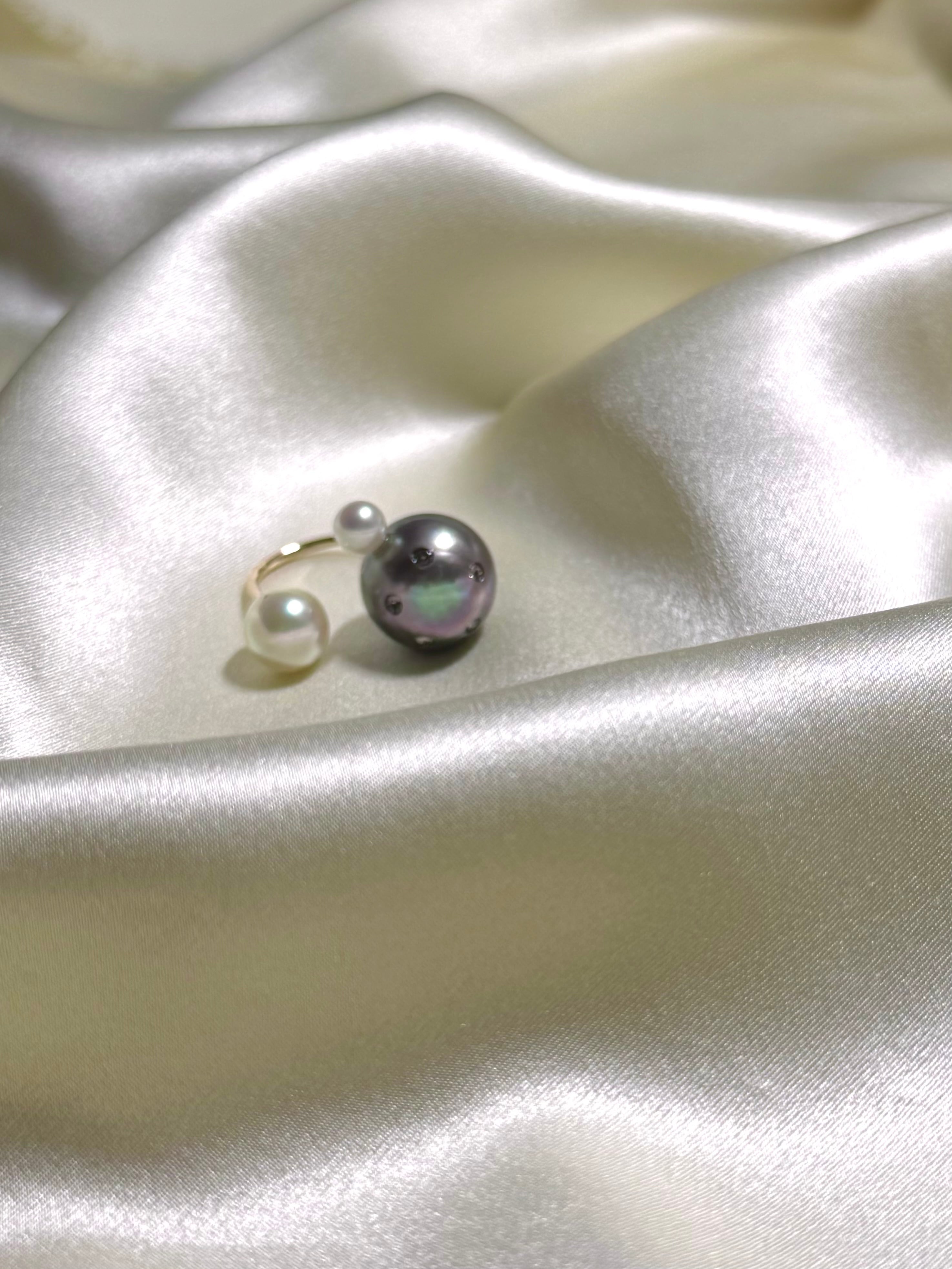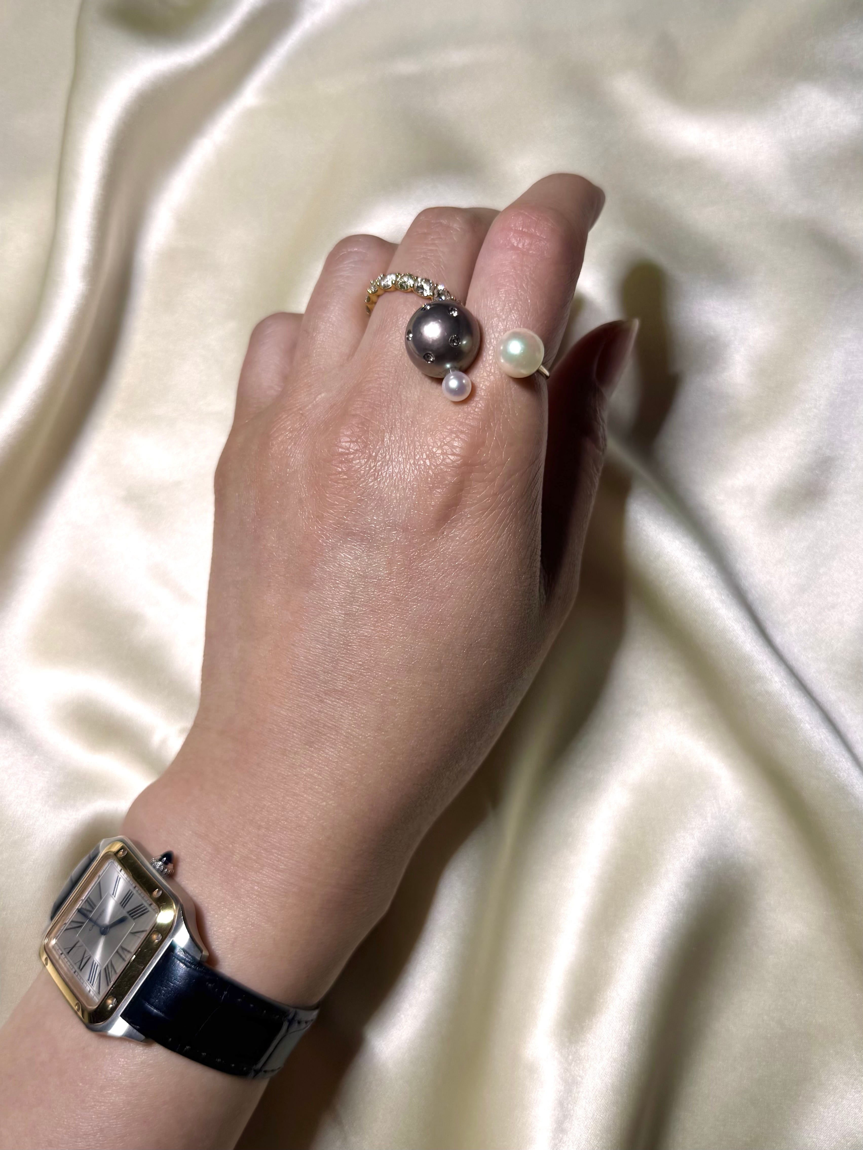 yumaの看板アイテムとなった大中小のパールがリズムよく指の上で吸いつくように並んだyuma ring。