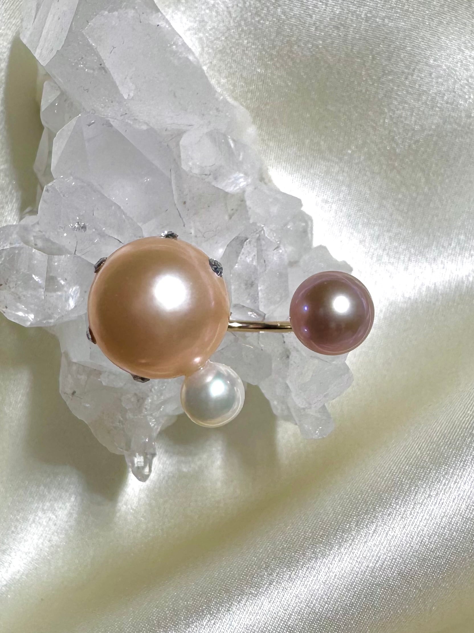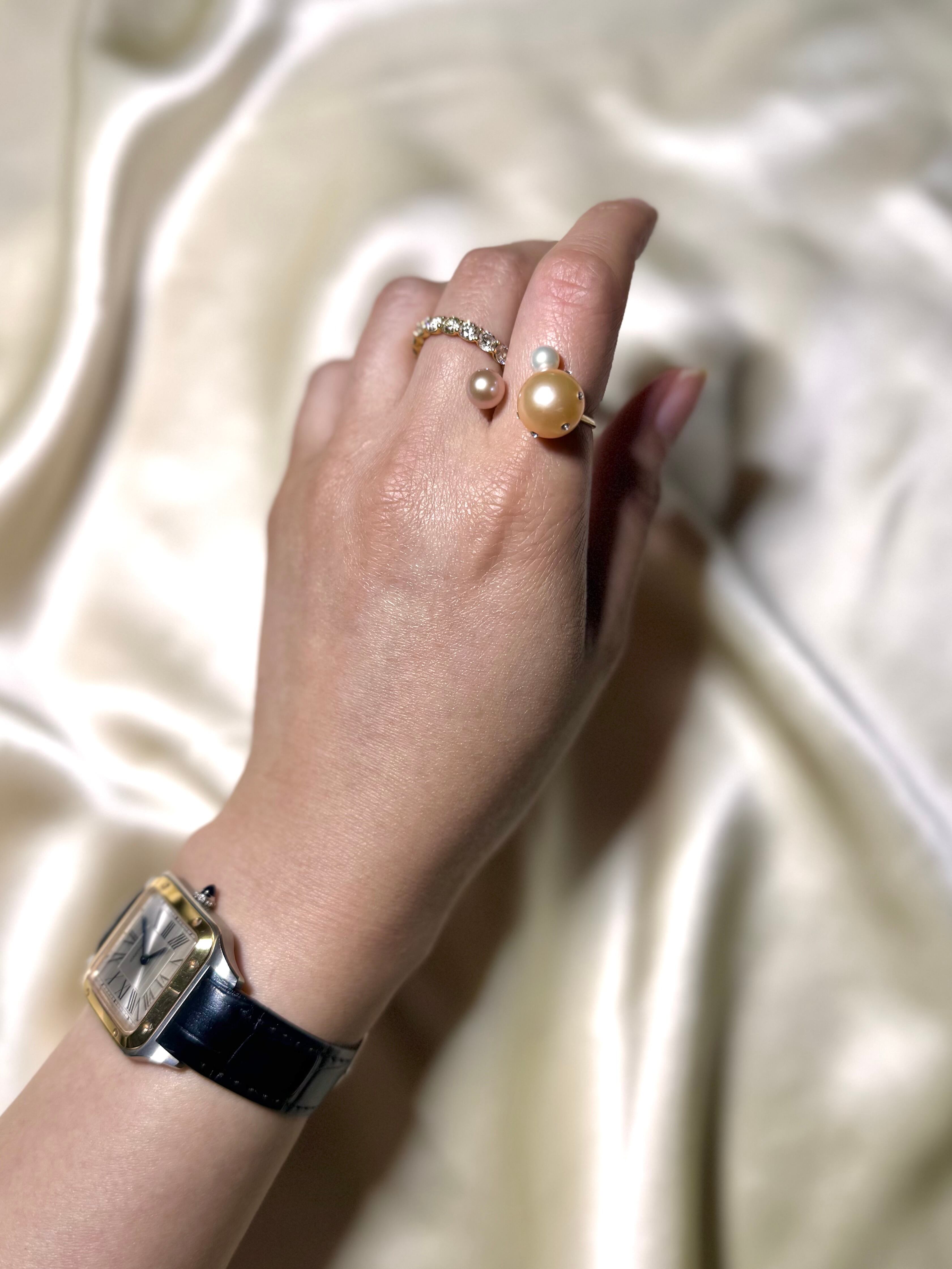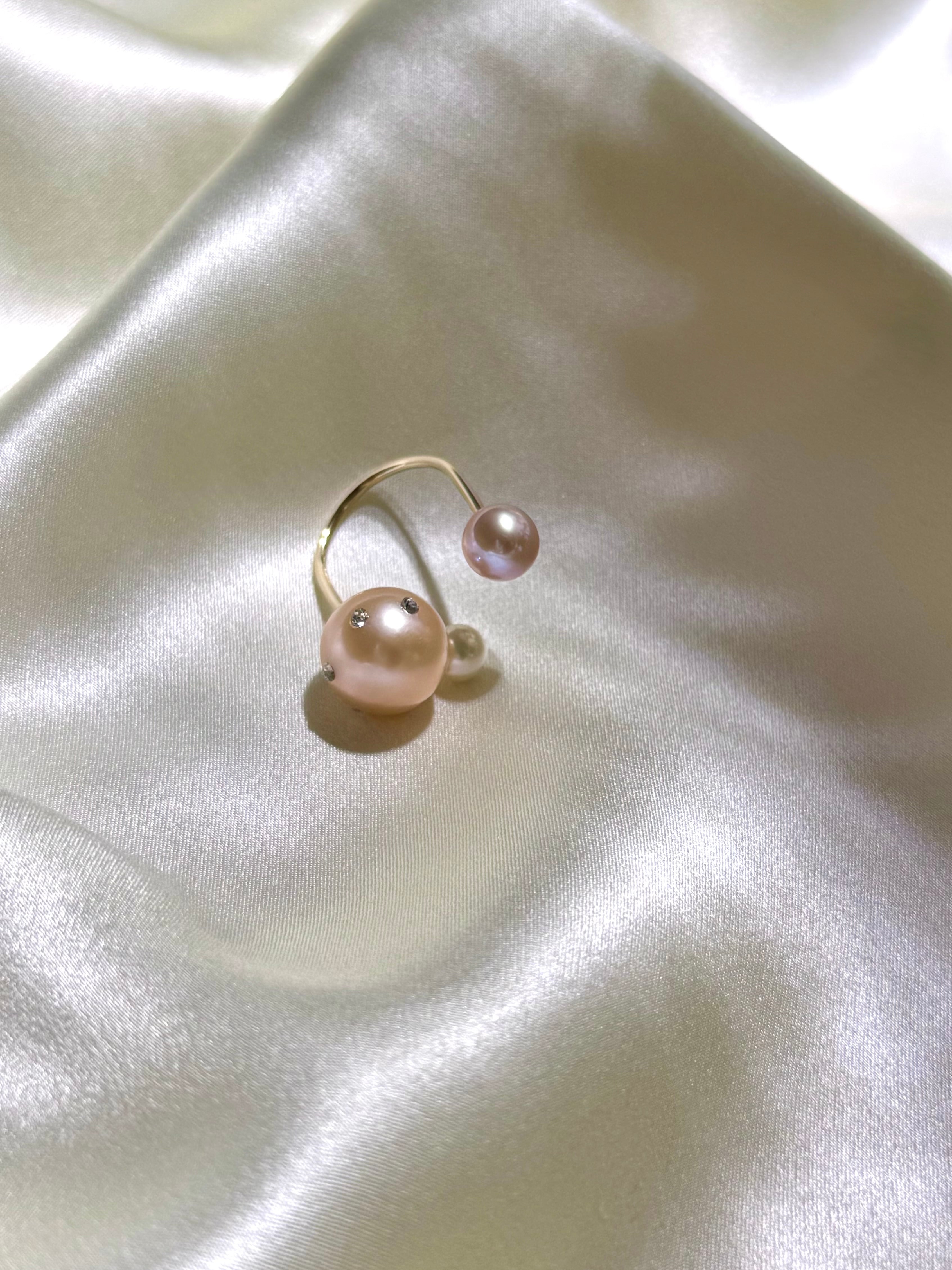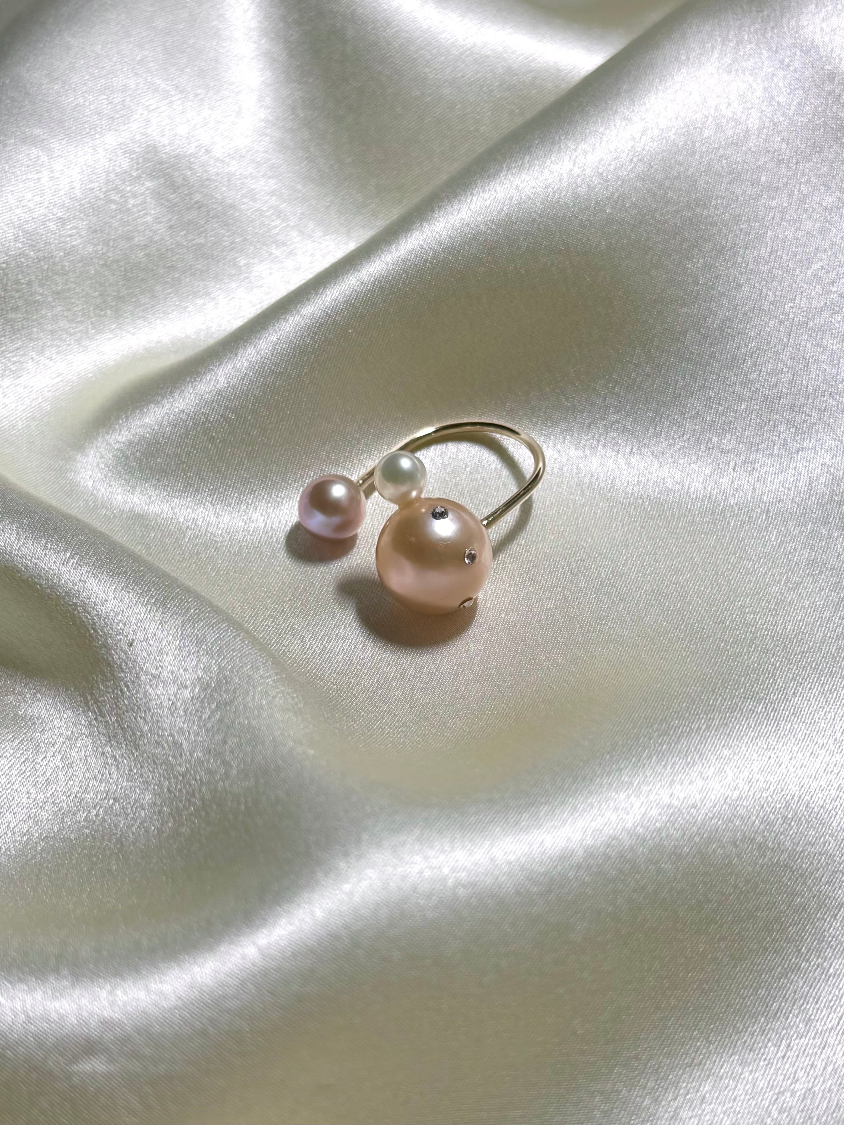 yumaの看板アイテムとなった大中小のパールがリズムよく指の上で吸いつくように並んだyuma ring。