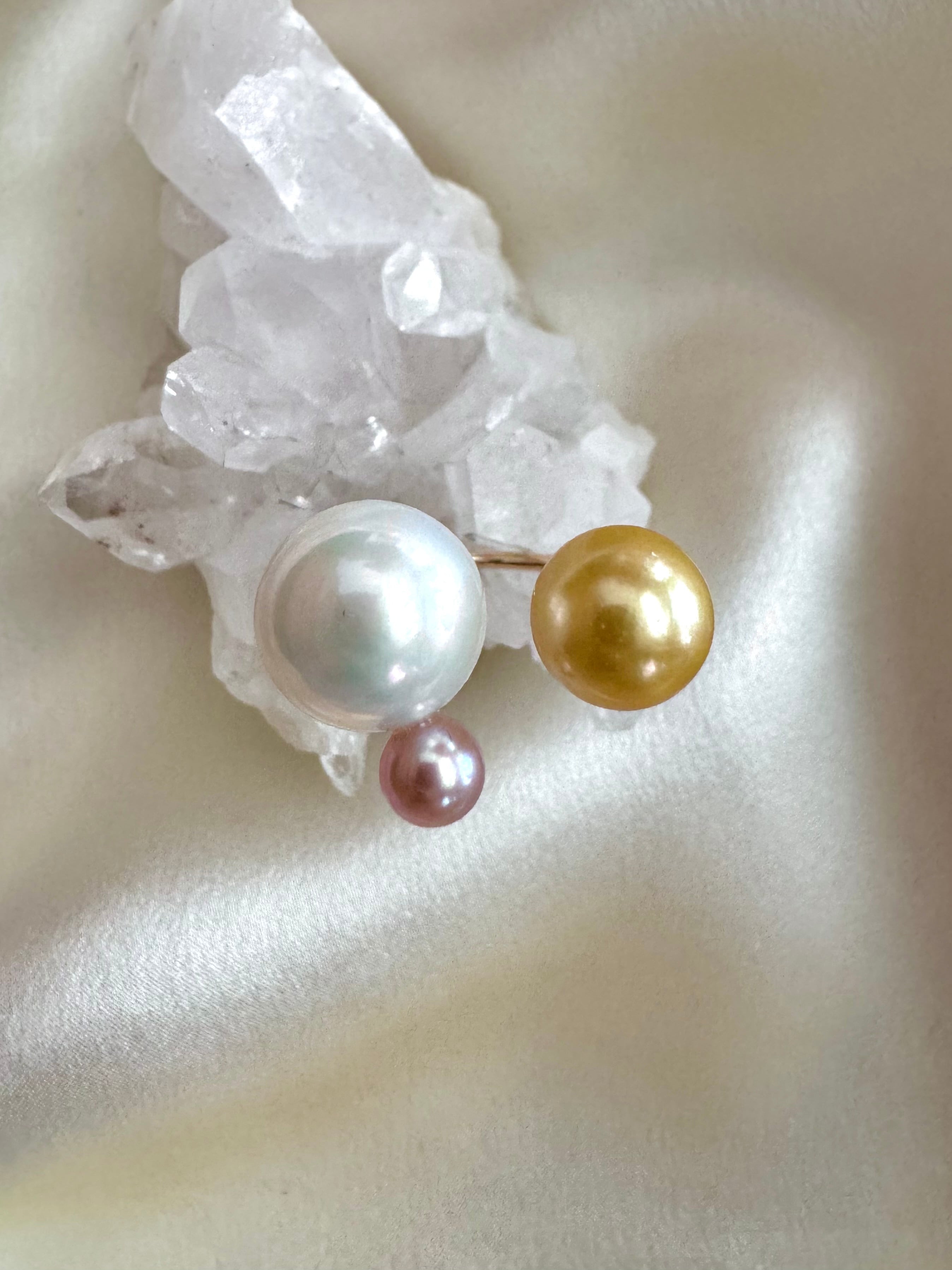 ピンクとブルーの干渉色のあるホワイトにとても綺麗なイエローの南洋真珠とピンクパールを合わせてポップで可愛らしいカラースキームに仕上げました。