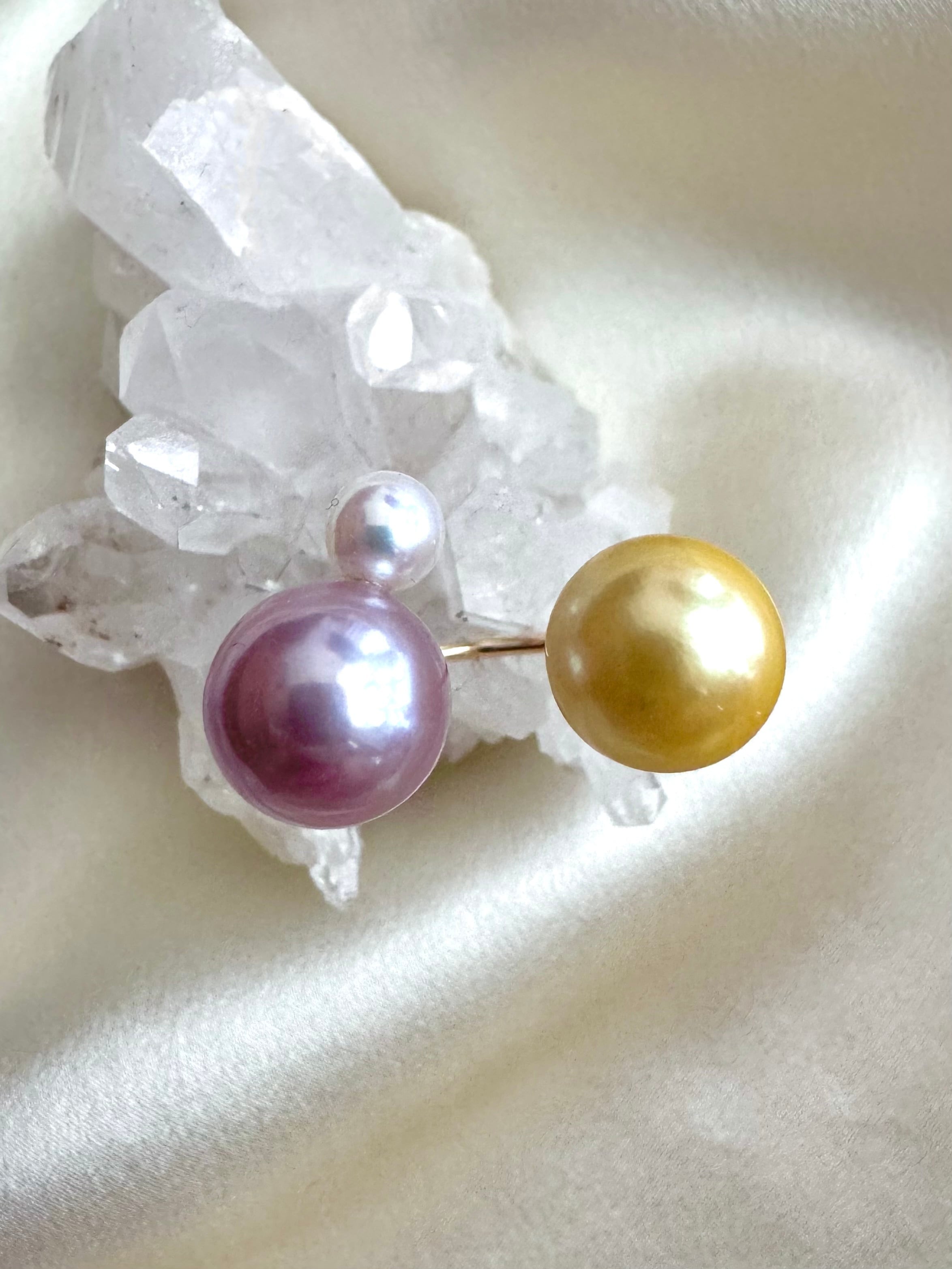 天然でこんなイエローあるの?!と思わず歓喜した絵の具のような発色の南洋パールには、艶々のラベンダーを合わせて夢可愛い感じに仕上げました。この天然イエローにはみんな目を疑うはずです笑。小粒パールまでてりってりキラキラで最高のコンビネーションです。推しリングの一つです。