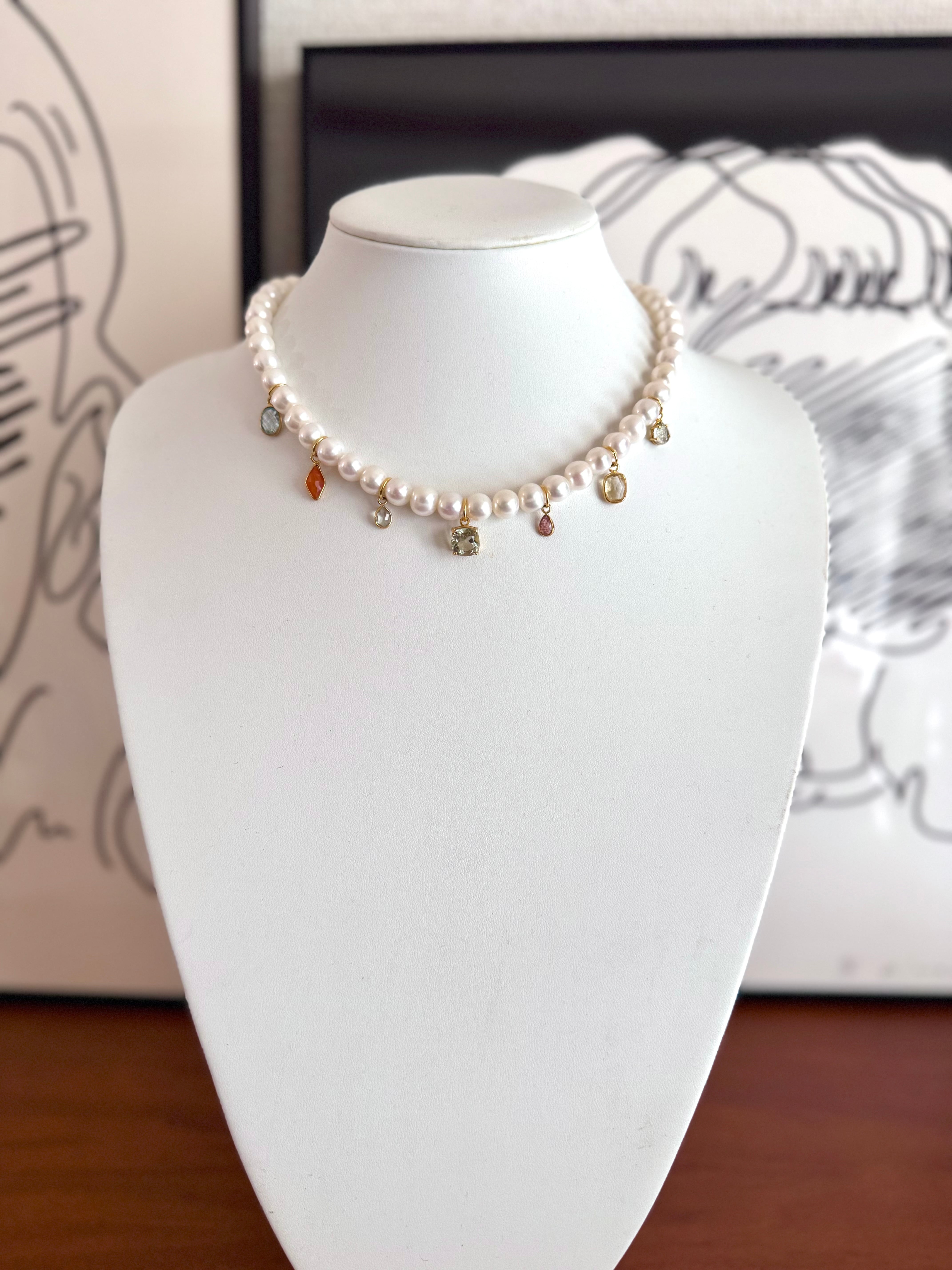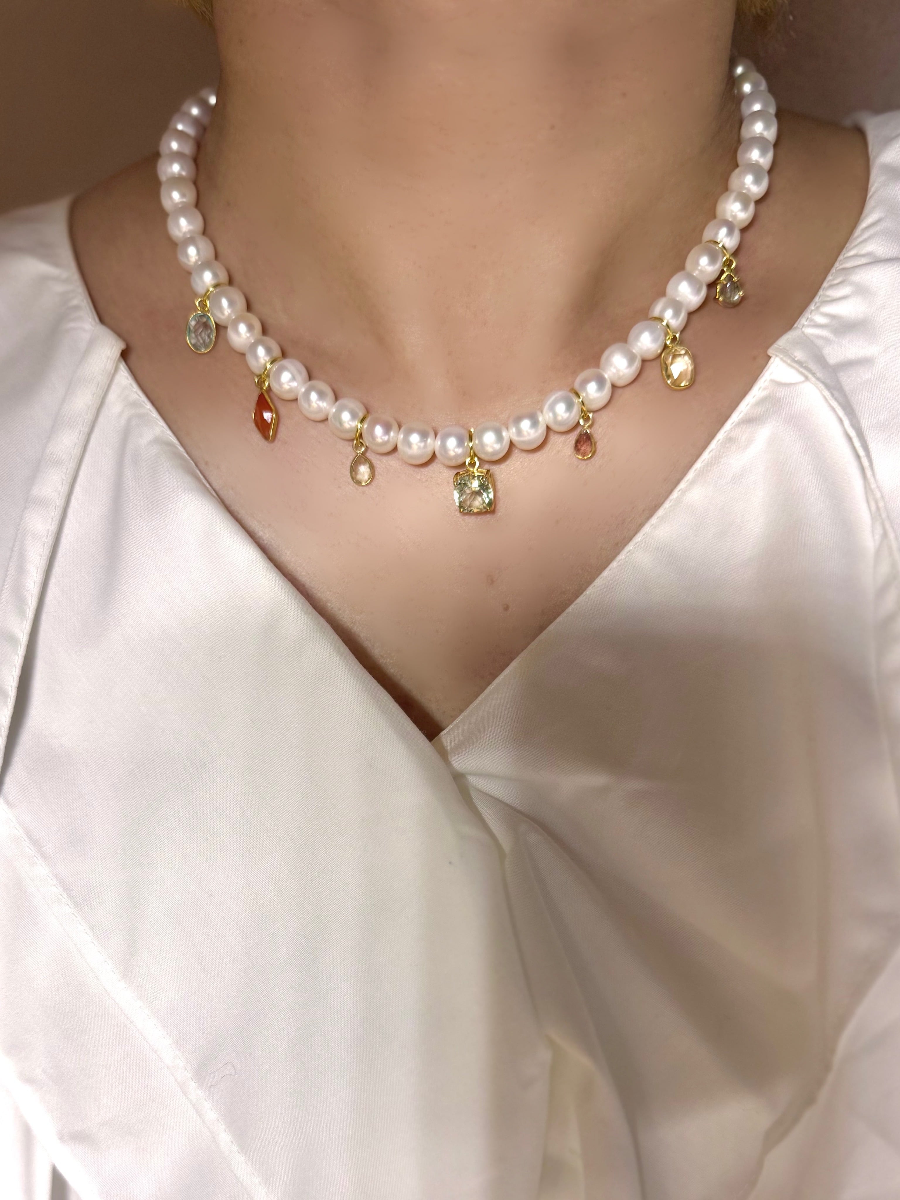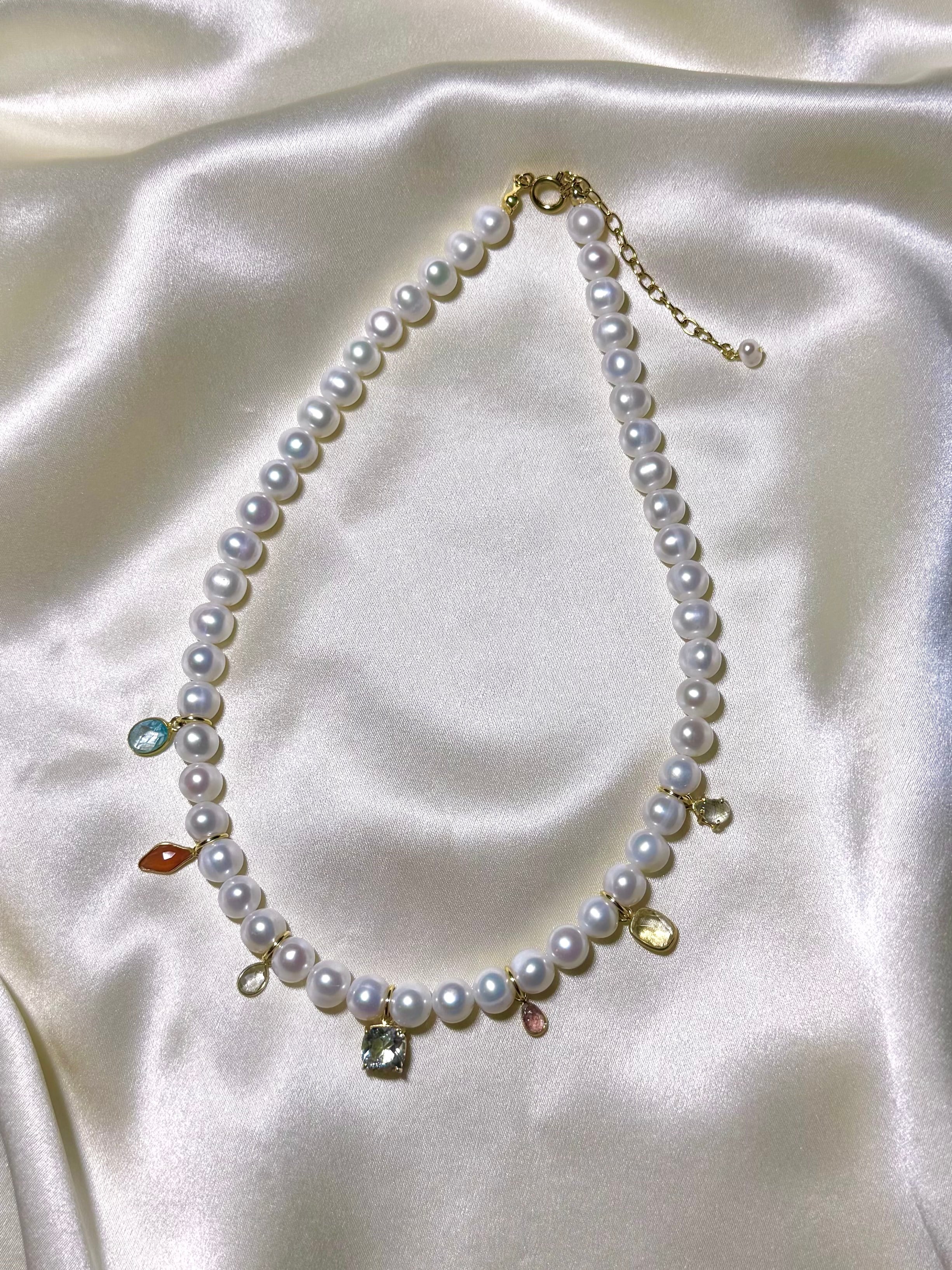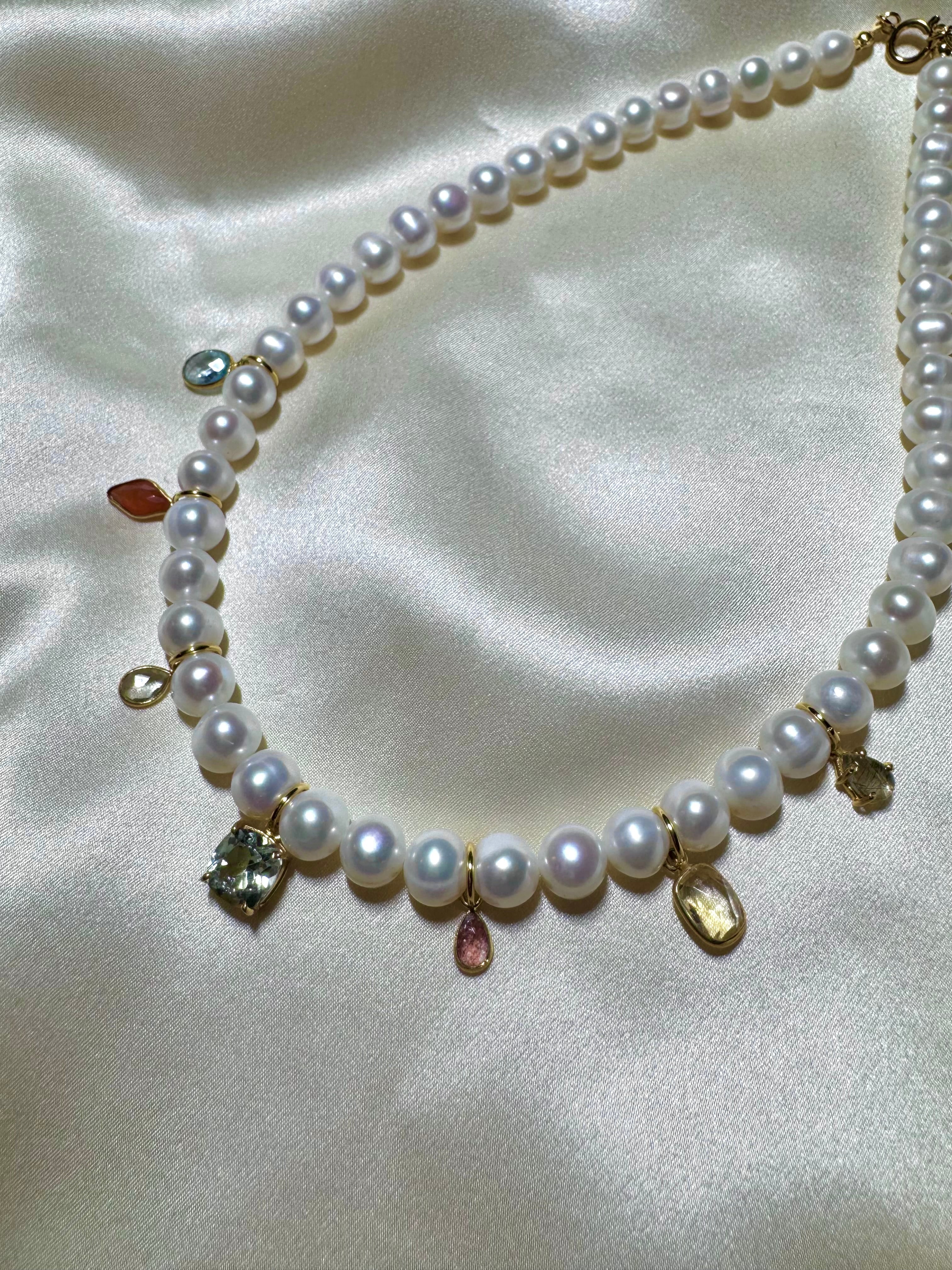 大人がつけても様になるよう天然パールをベースに宝石ランクの美しい天然石のチャームたちを。