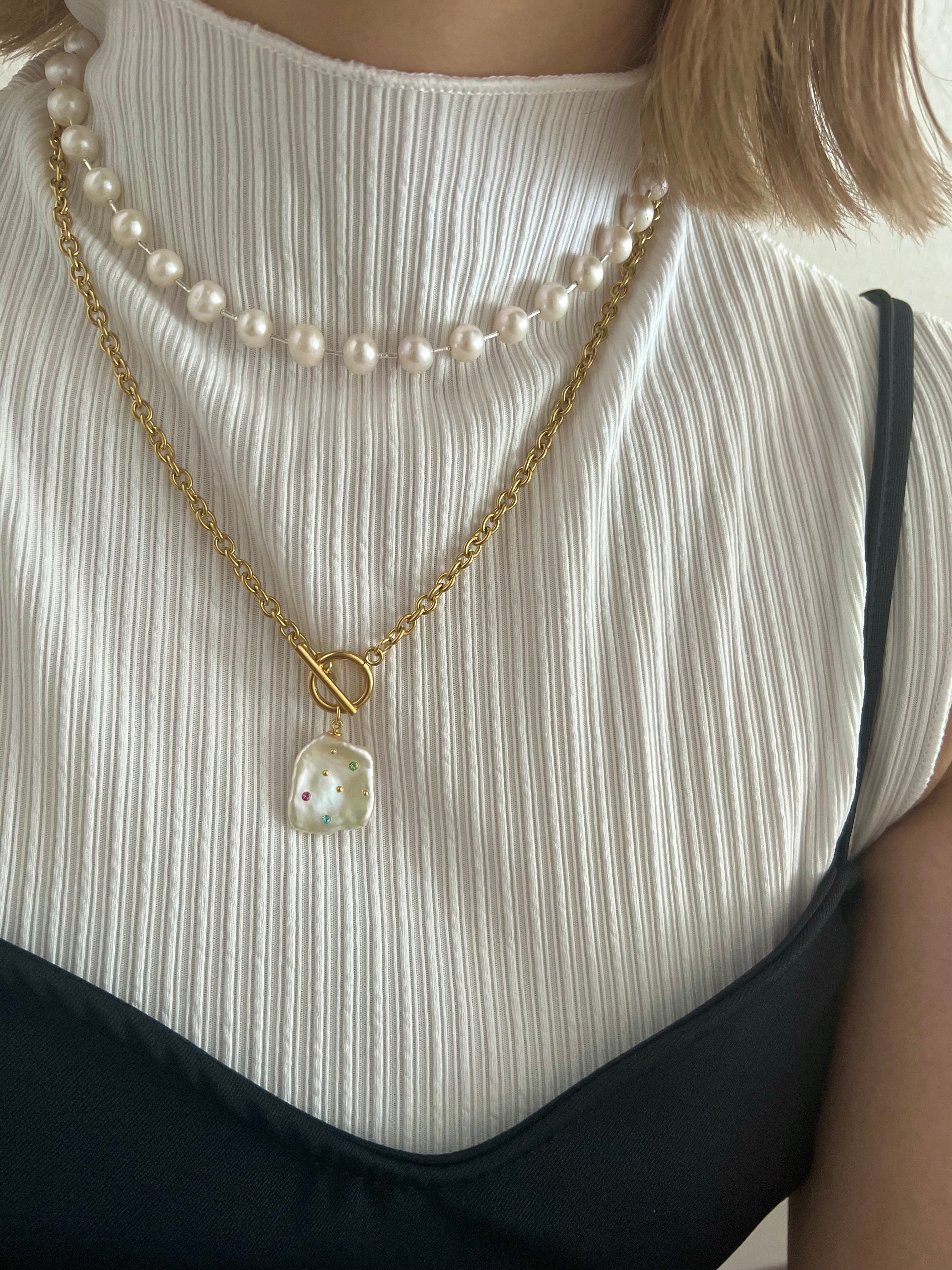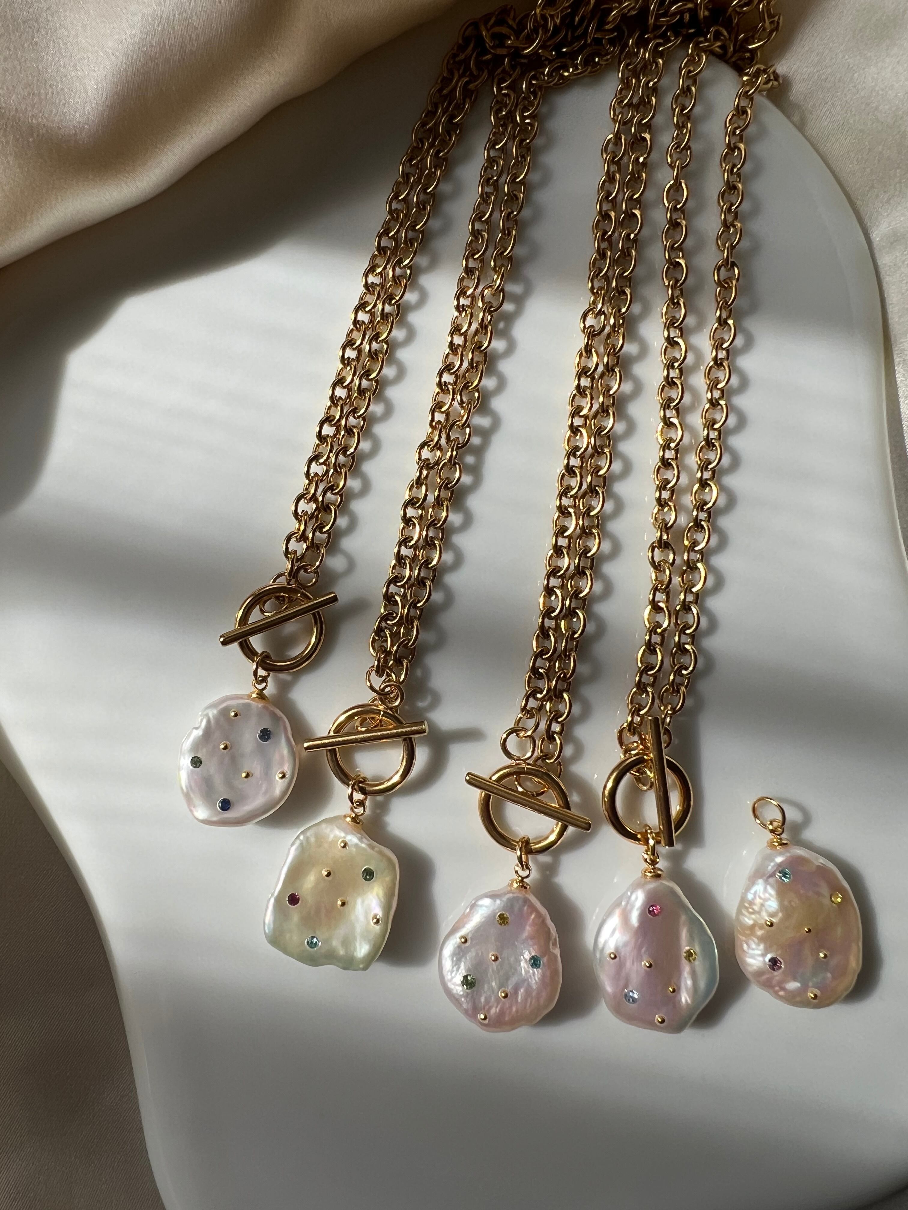ペタルパールにカラフルなキラキラストーンとスタッズを一つ一つ埋め込んでいます。太めのチェーンがポイントです。これひとつでも可愛いですし流行りのレイヤードを楽しんでみるのも◎