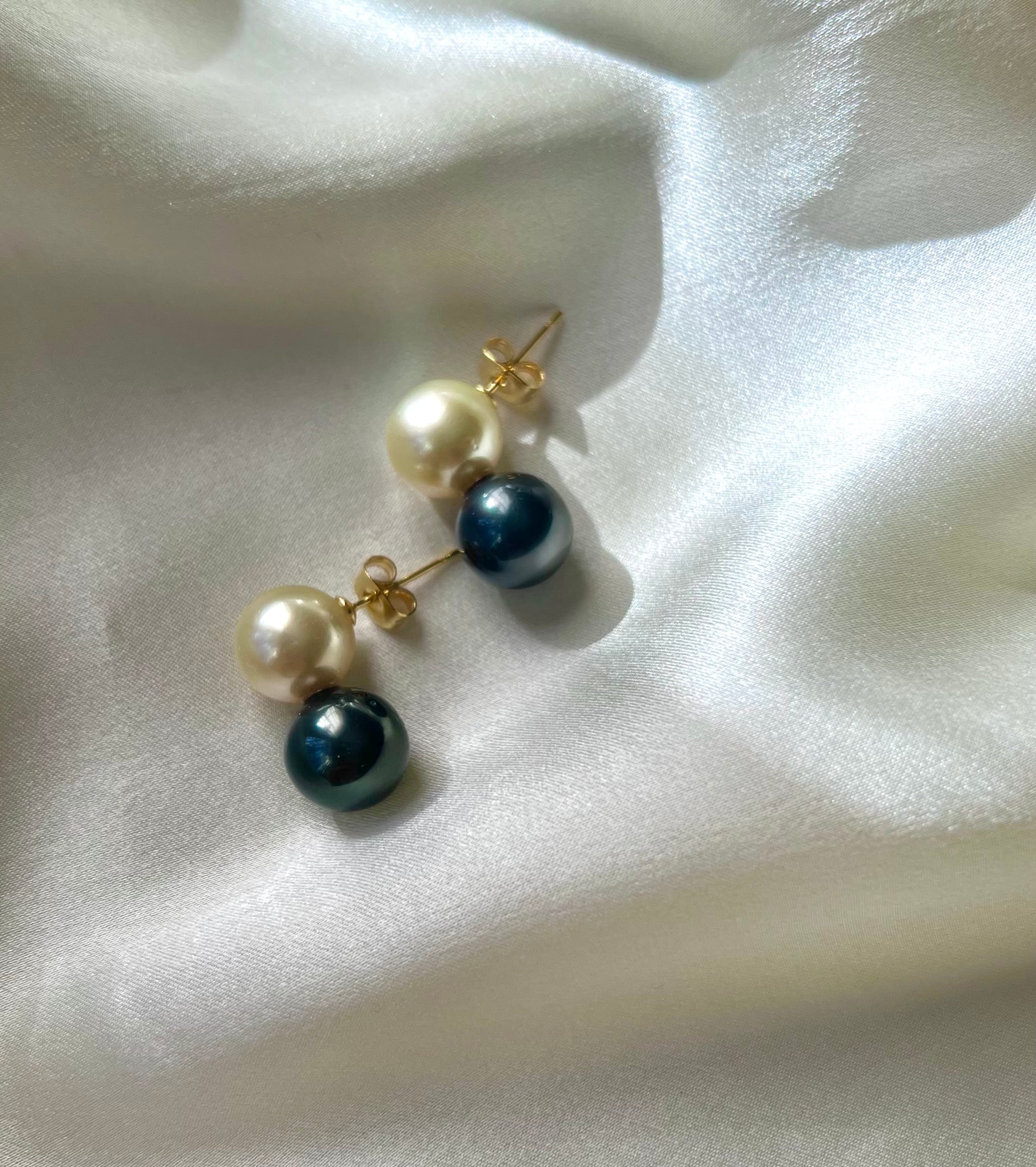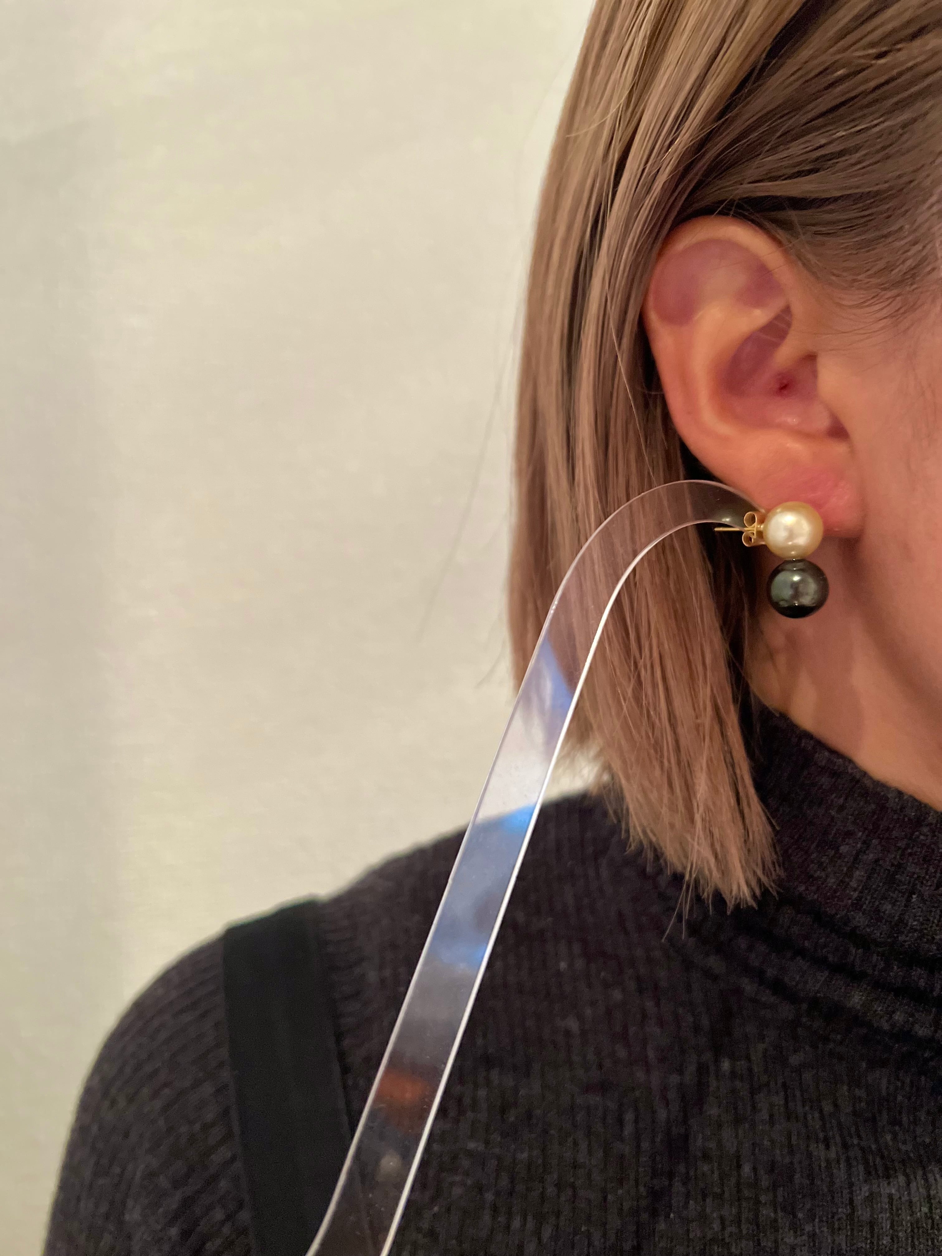 コントラストが美しいバイカラーのパールピアス(イヤリング)。