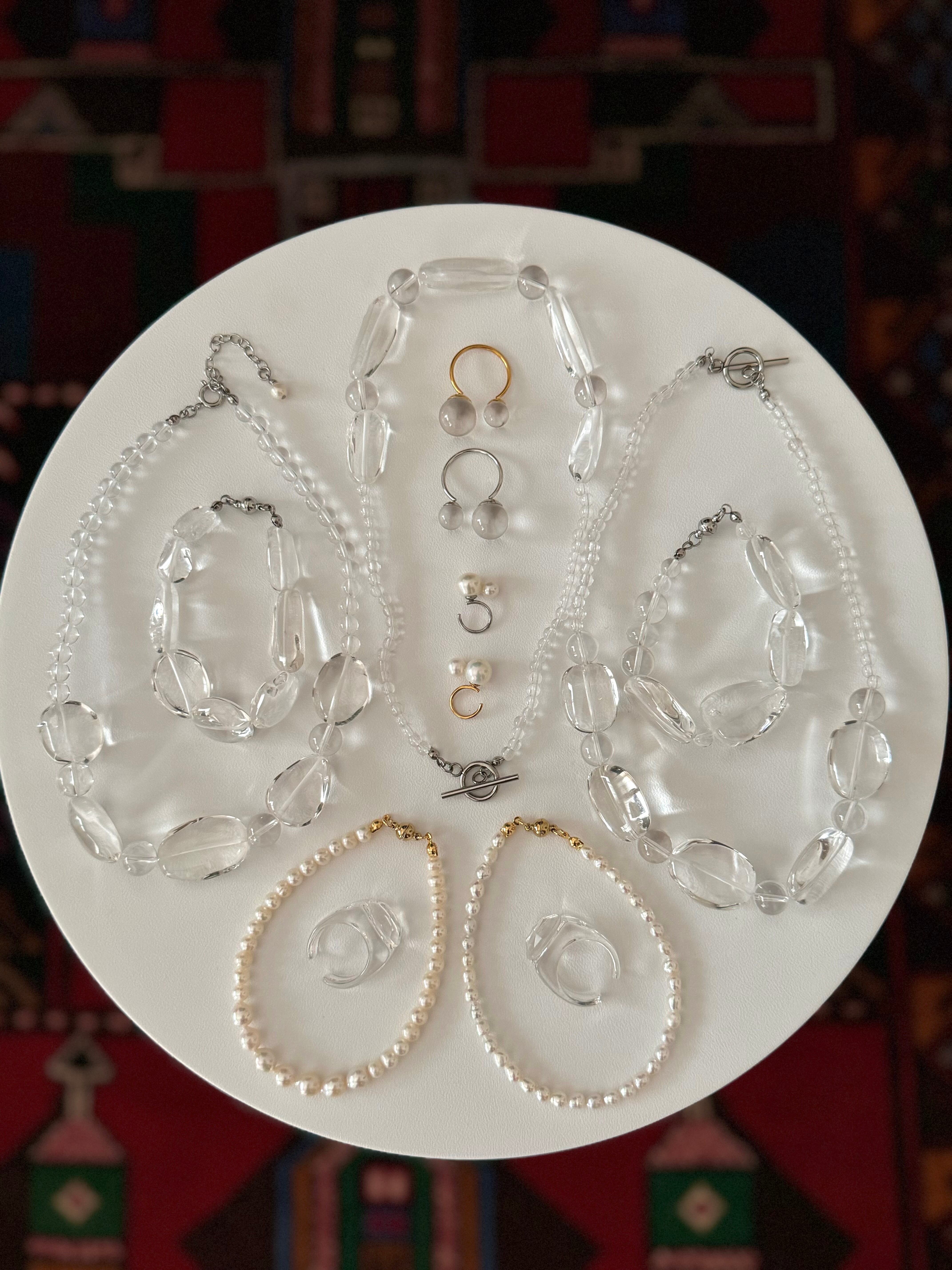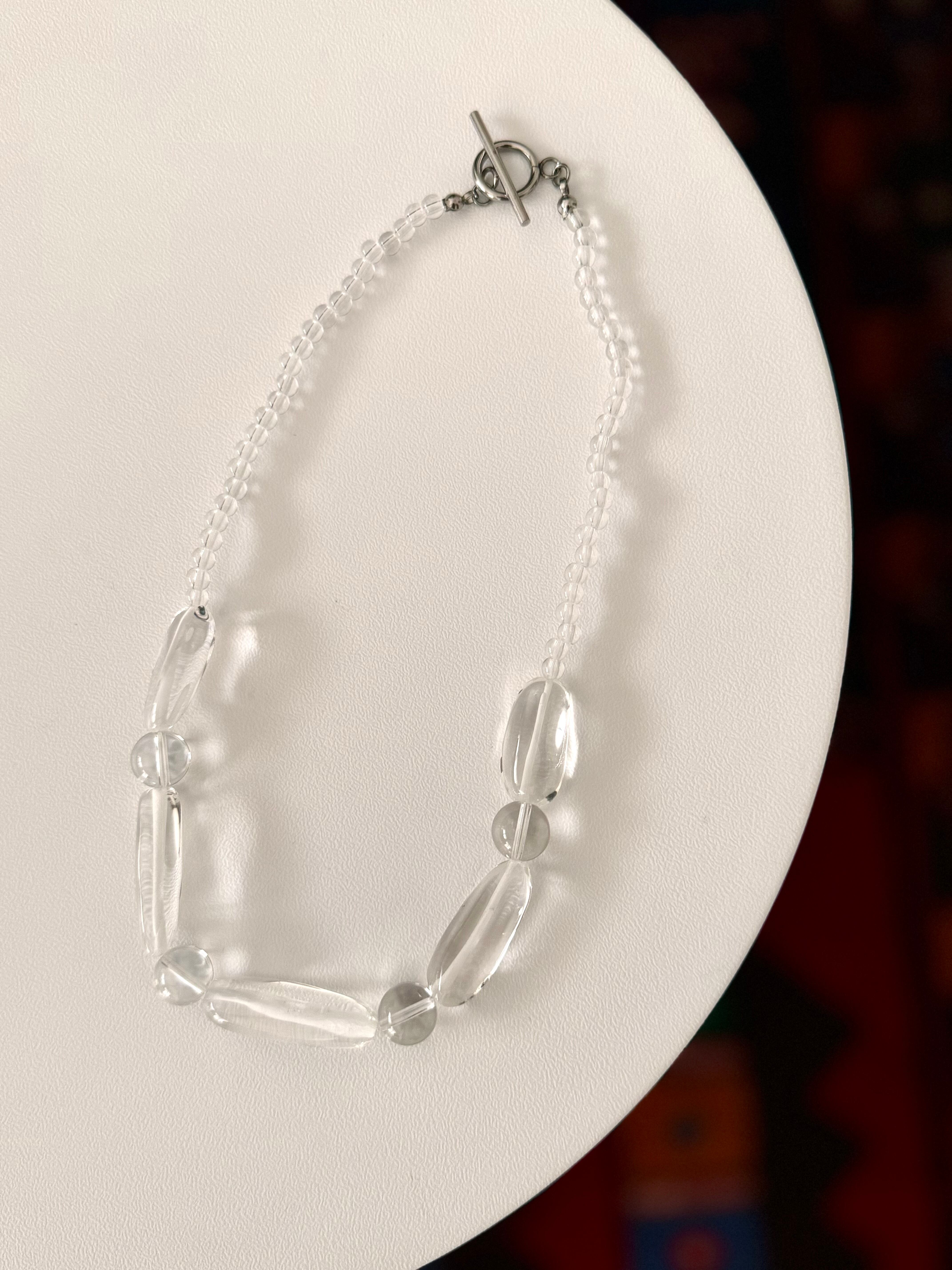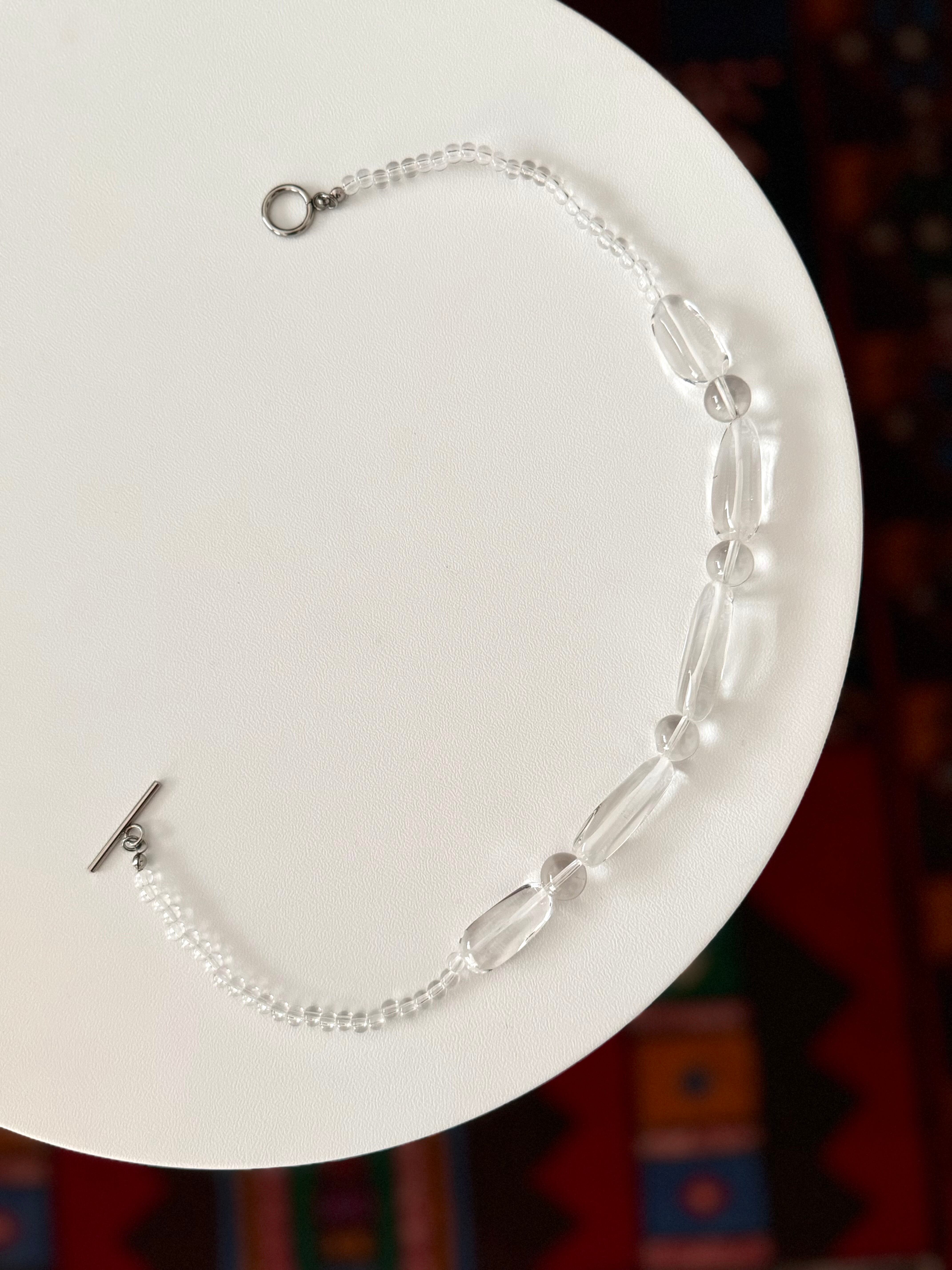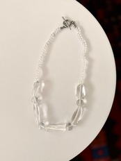 非常に透明度の高い天然クリスタルを大小ランダムに紡ぎ涼しげなネックレス。おおぶりですが、クリアカラーなので軽やかにつけられるオススメアイテムです。