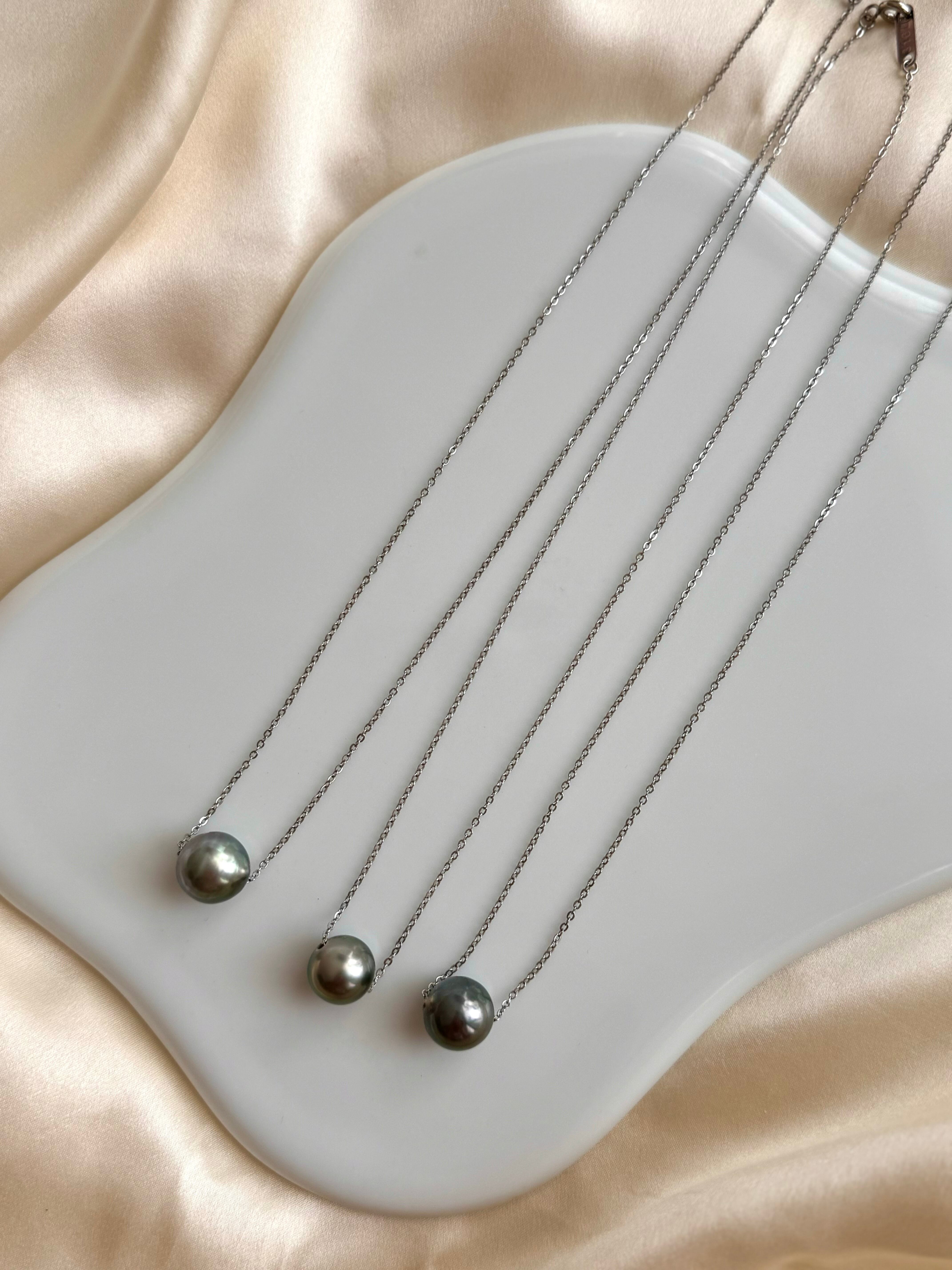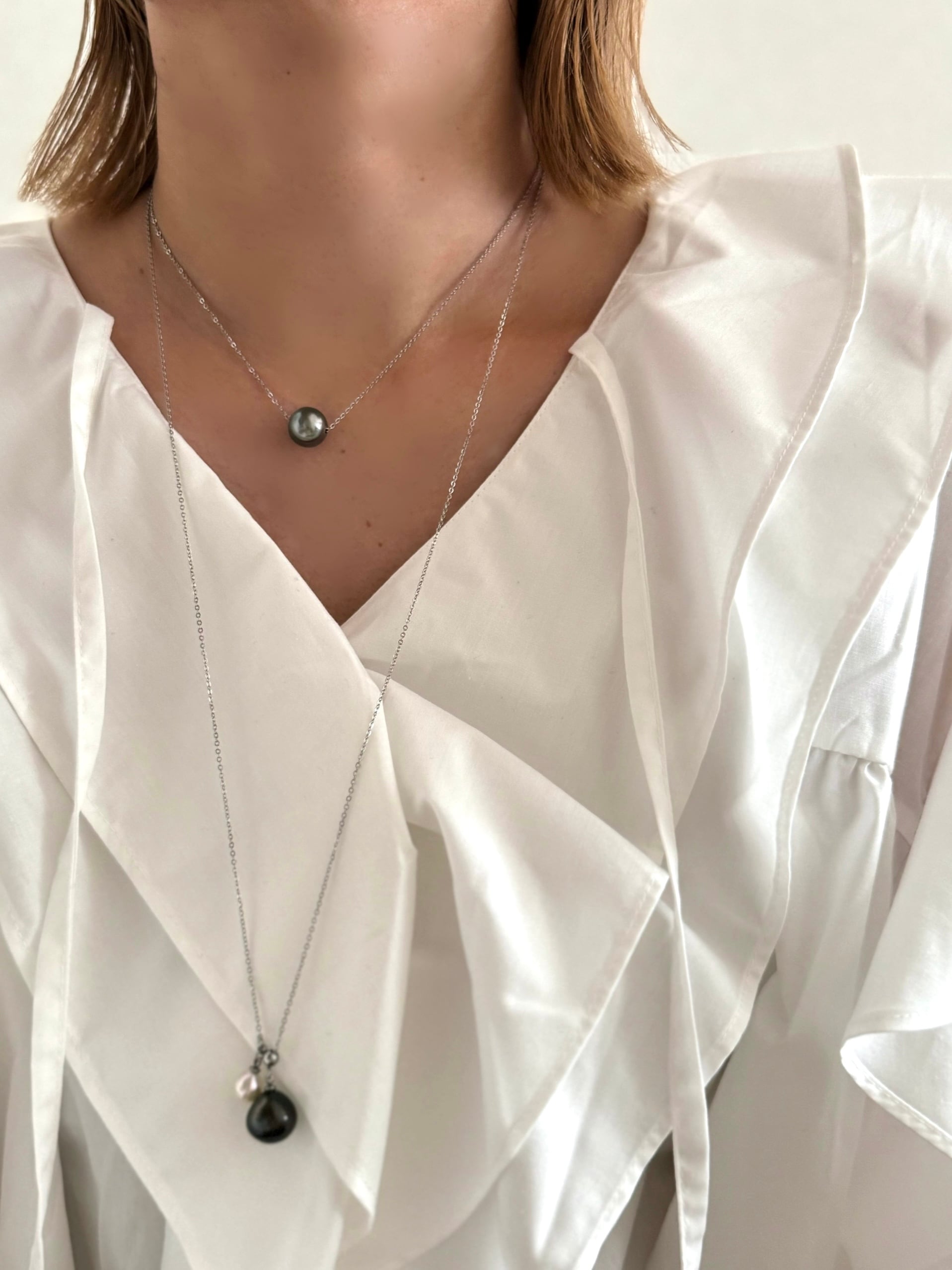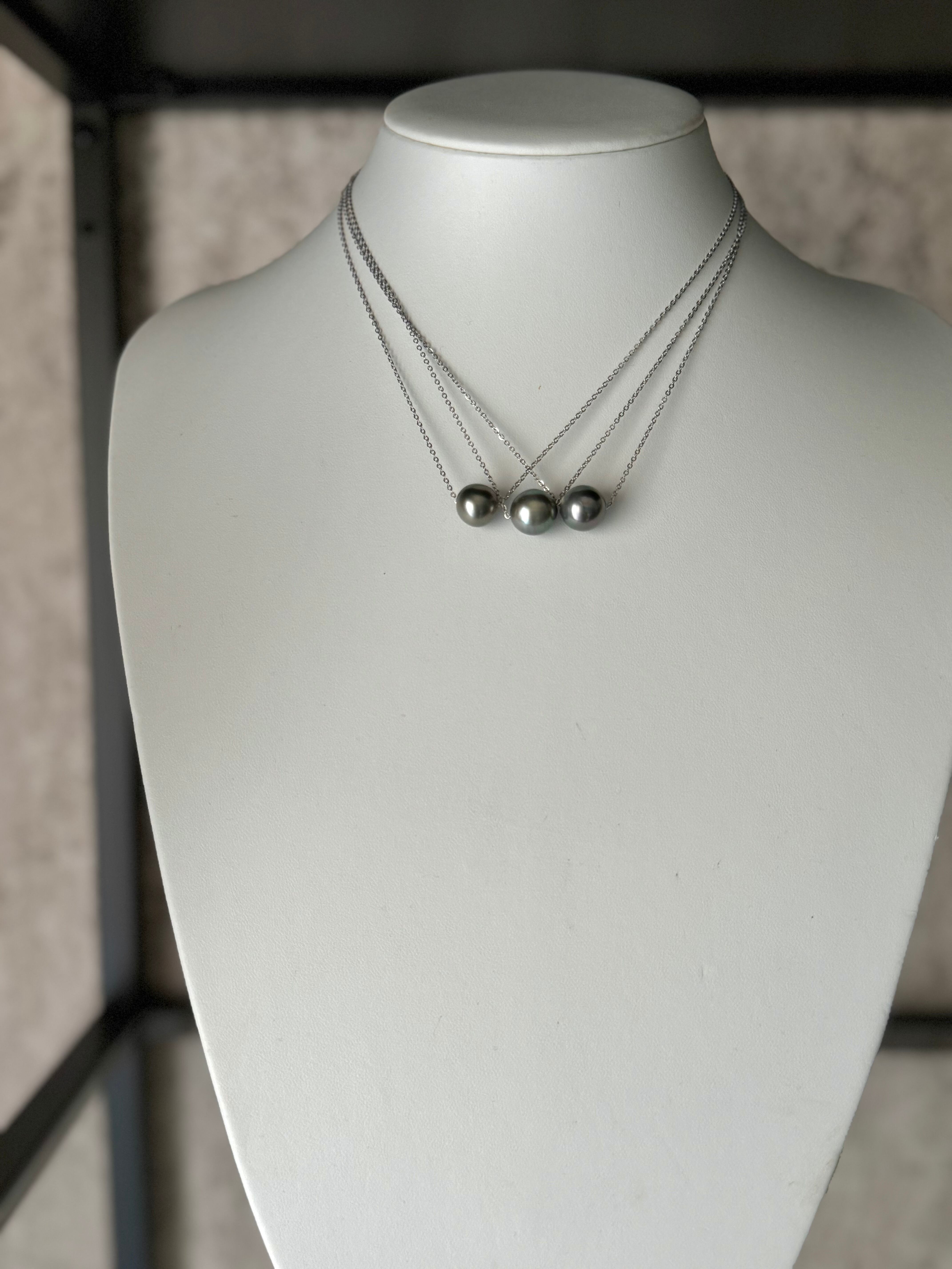 パールトップのバチカンなどの金具を省いたシンプルでモダンな黒蝶のスルーネックレス。