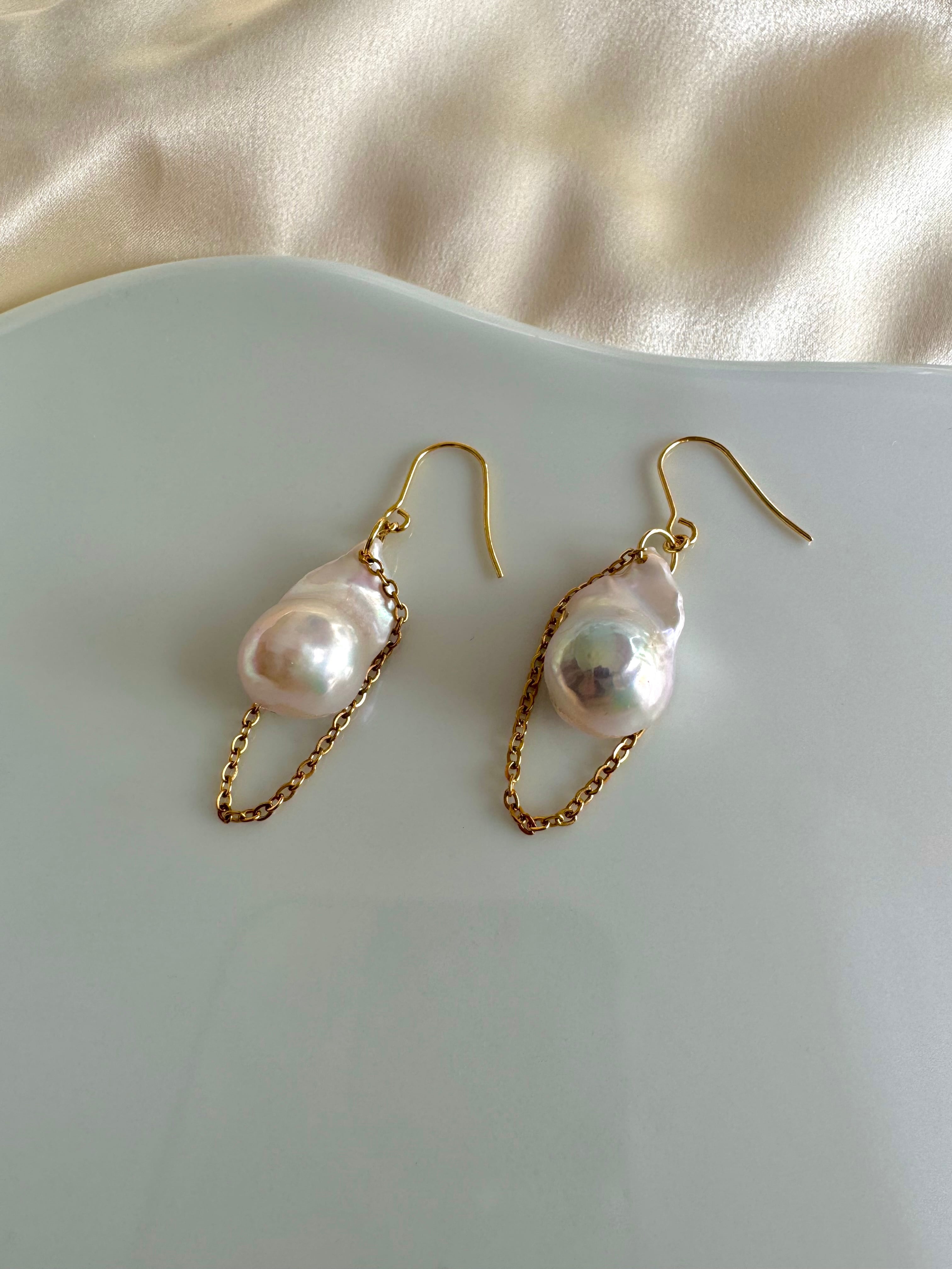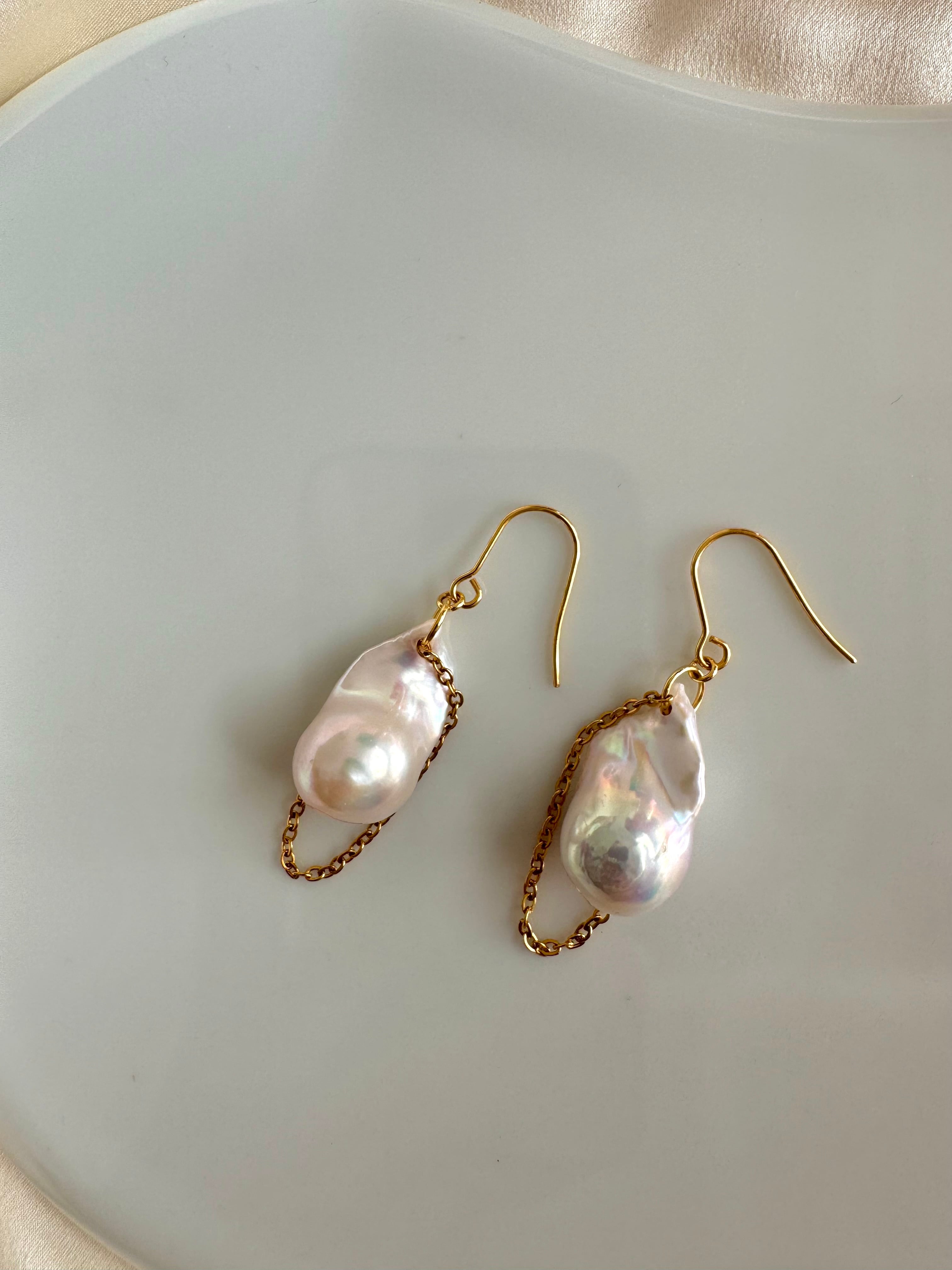 虹艶キラキラで形も揃ったバロックペアをチェーンで包み込んだデザイン。
